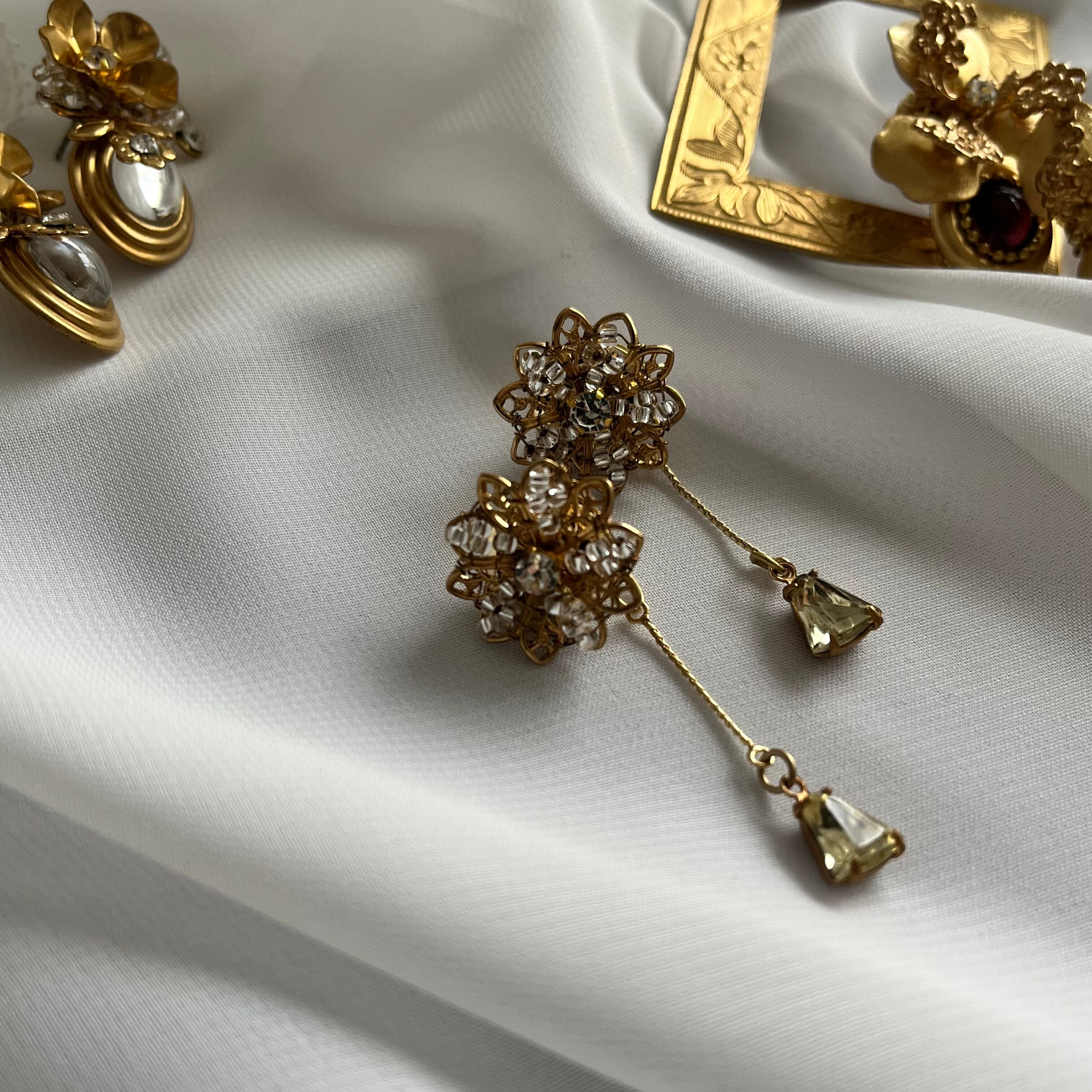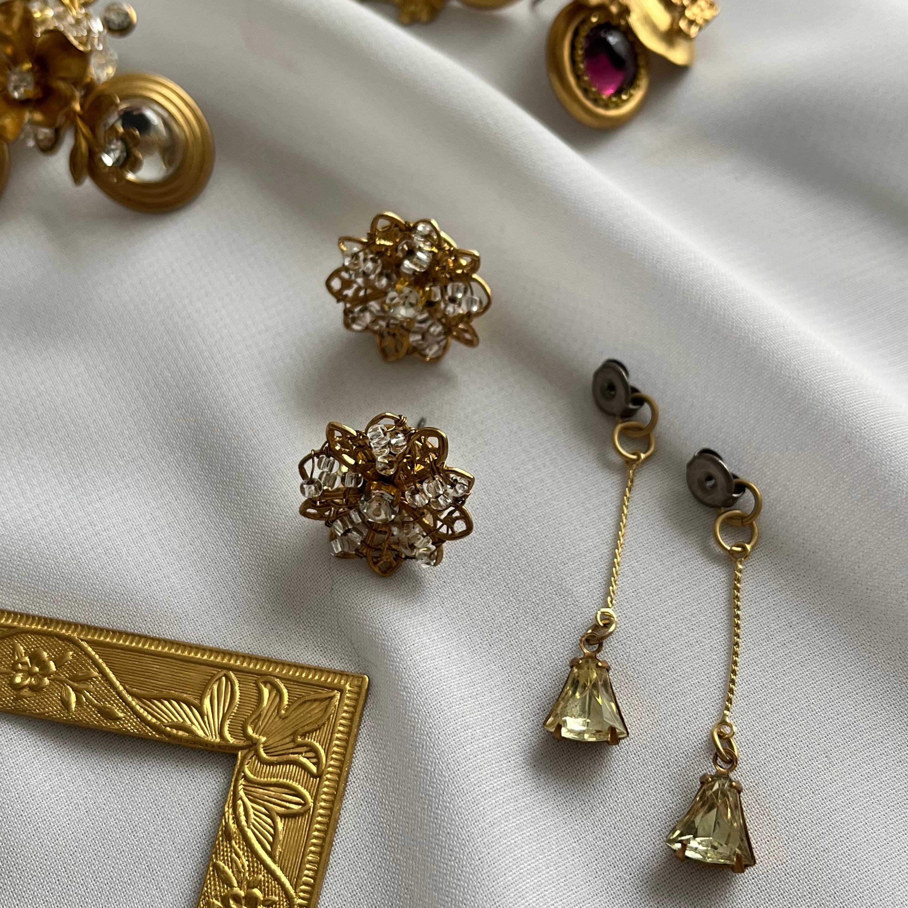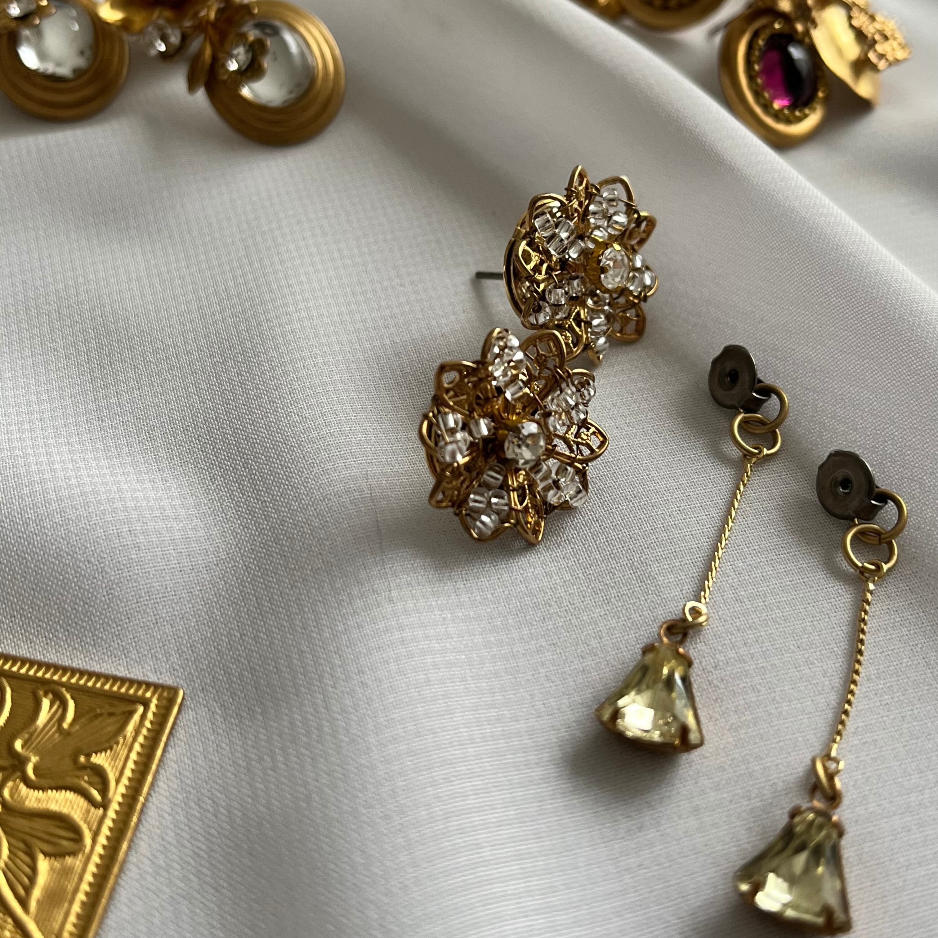 Import brass parts×vintage crystal grass stone ピアスまたはイヤリング