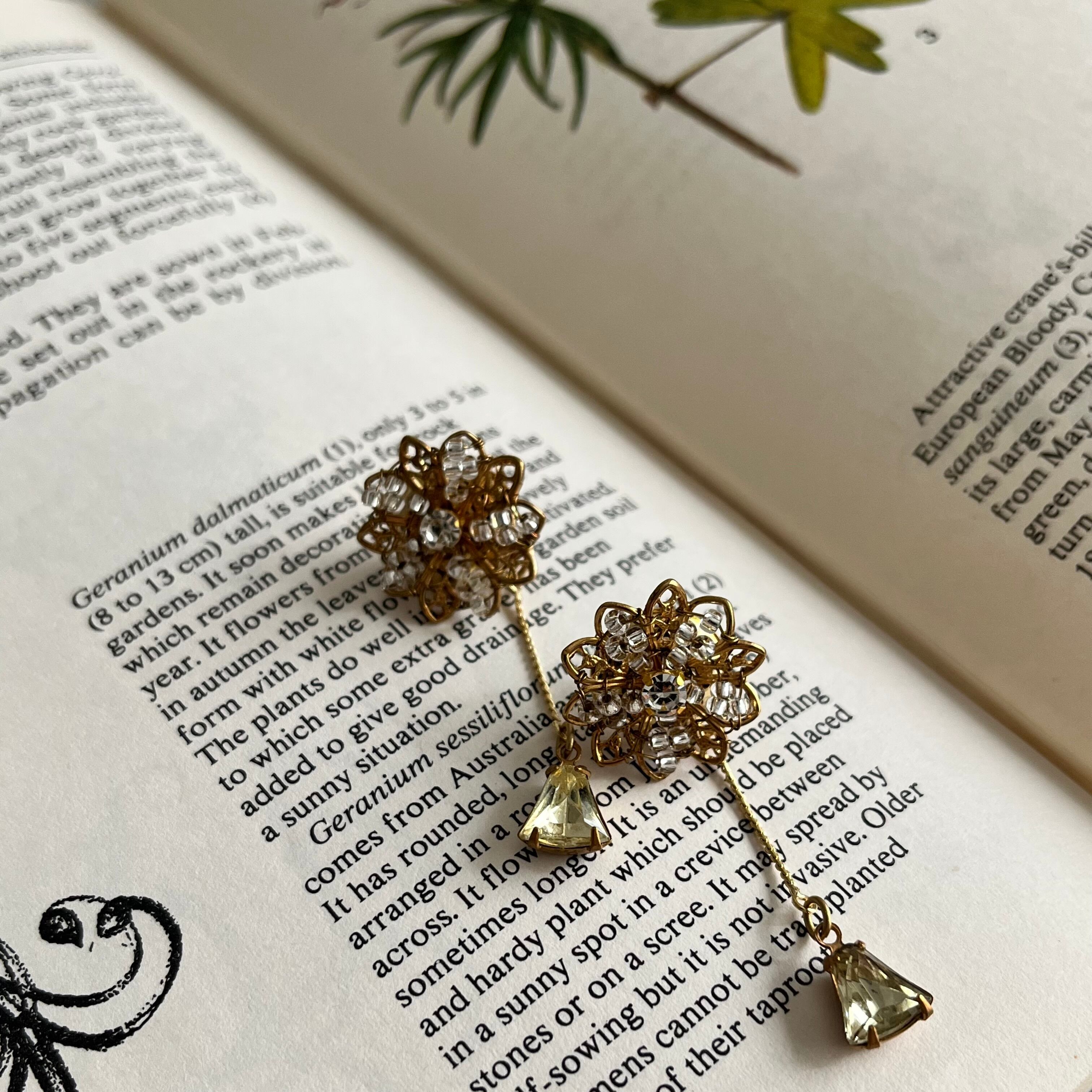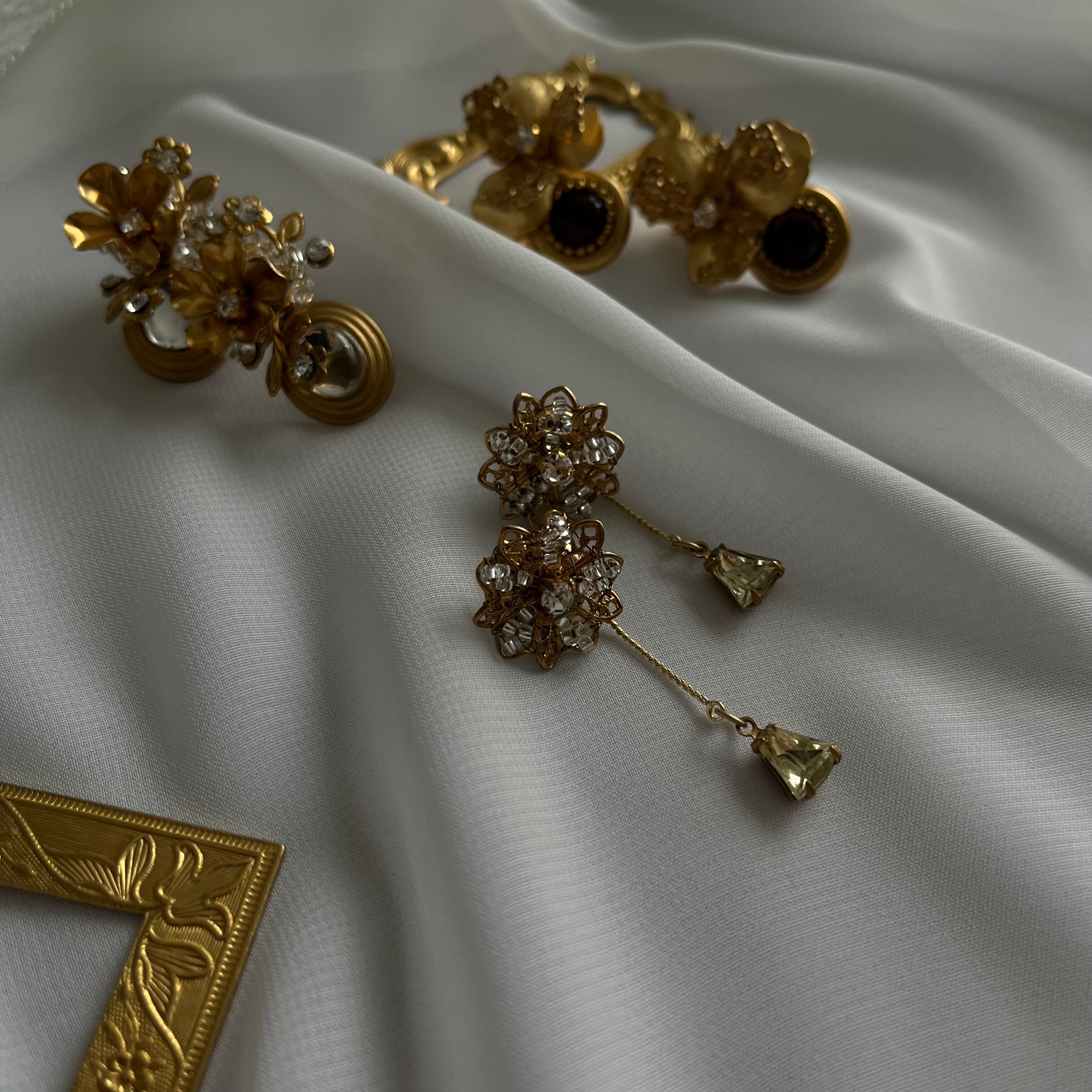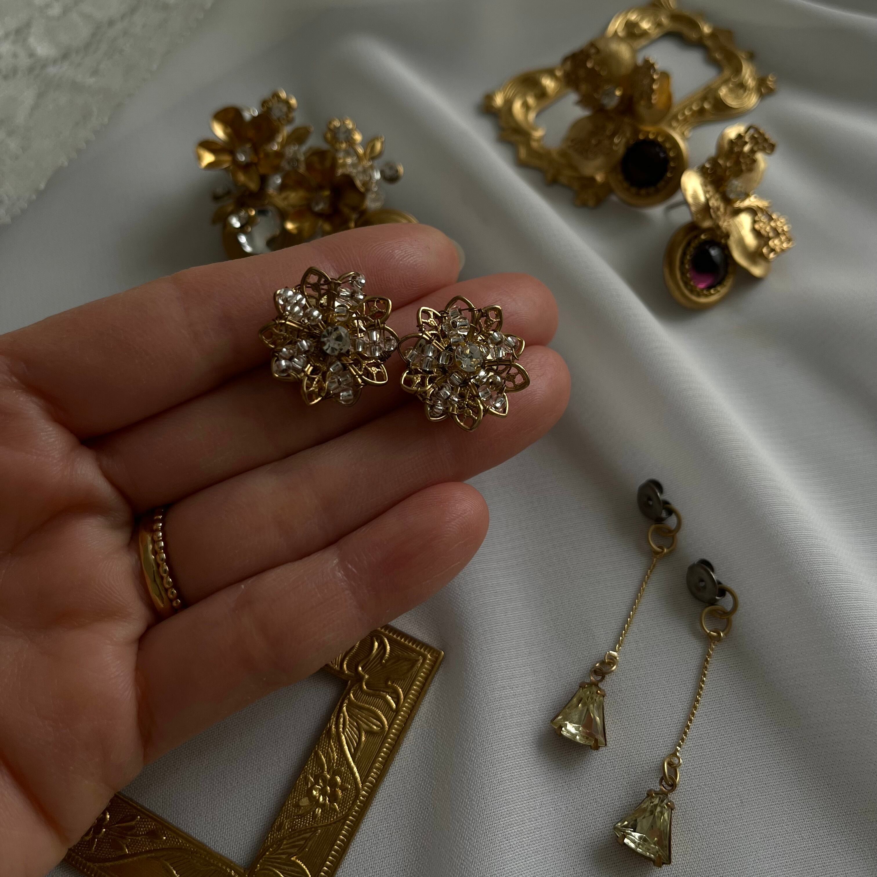 Import brass parts×vintage crystal grass stone ピアスまたはイヤリング