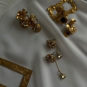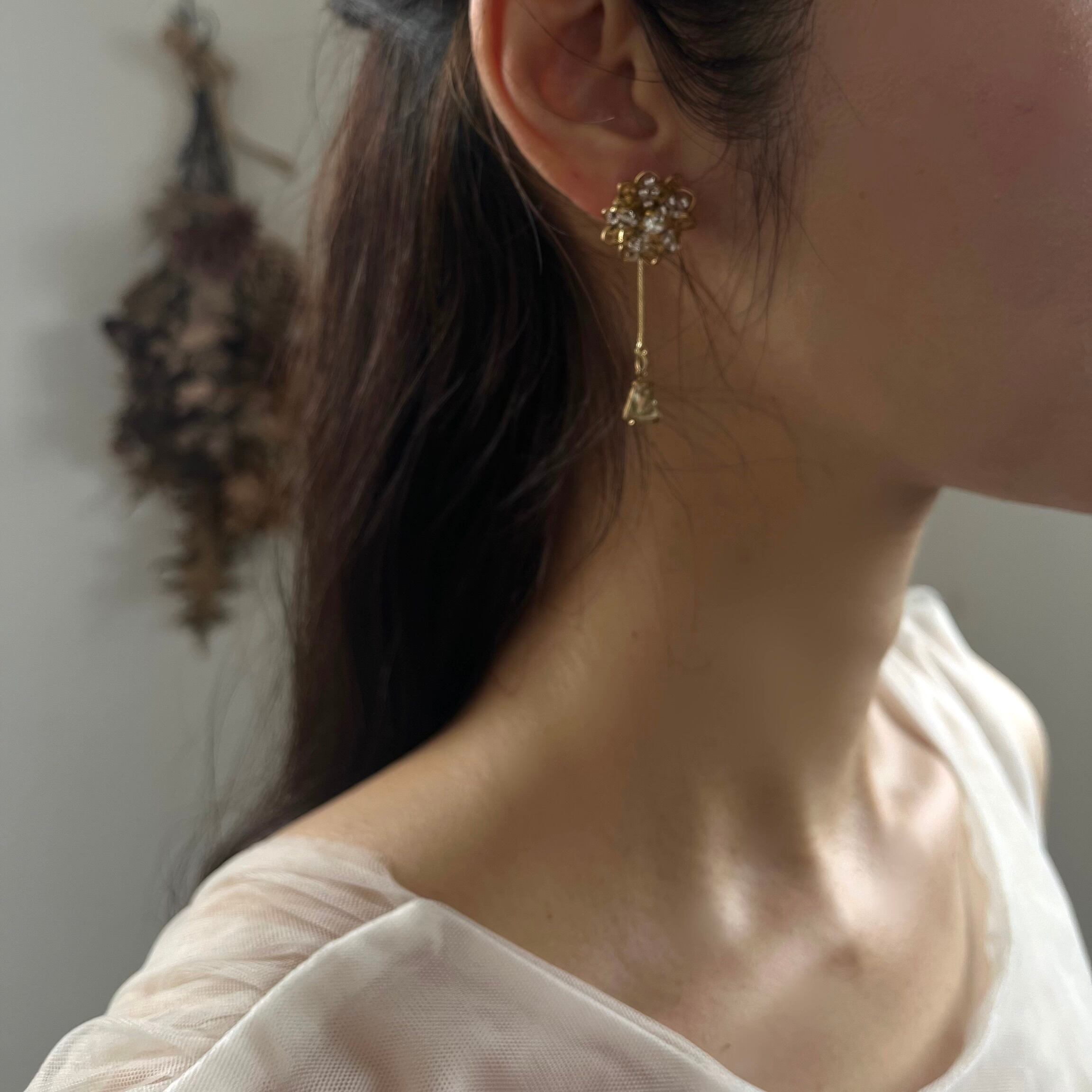 繊細な透かし模様が美しい真鍮フィリグリーパーツを耳元に、華奢なチェーンとヴィンテージ ストーンを合わせたピアス(イヤリング)。