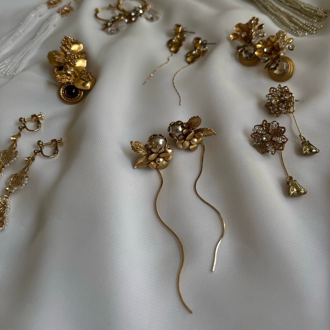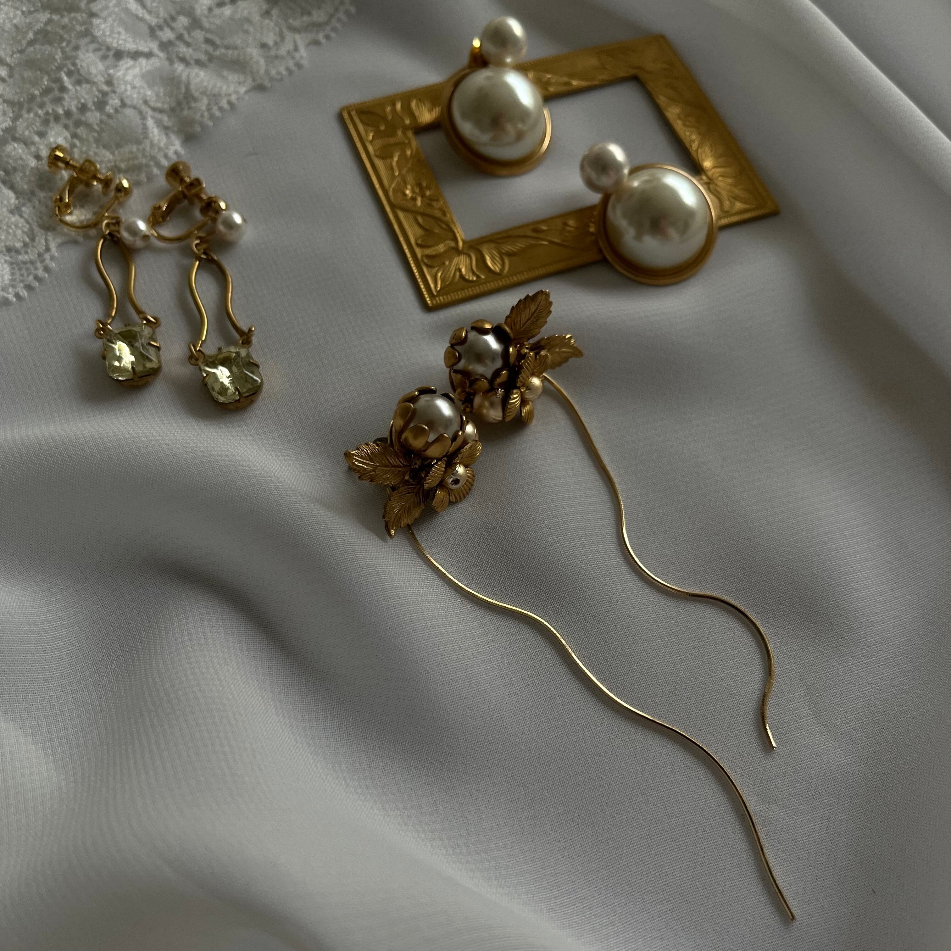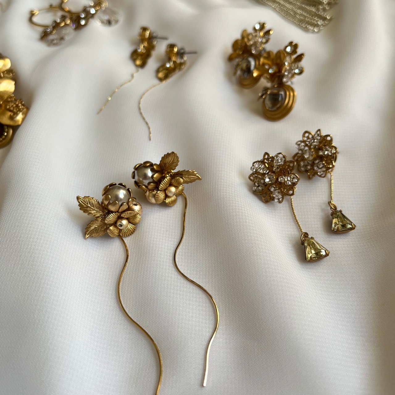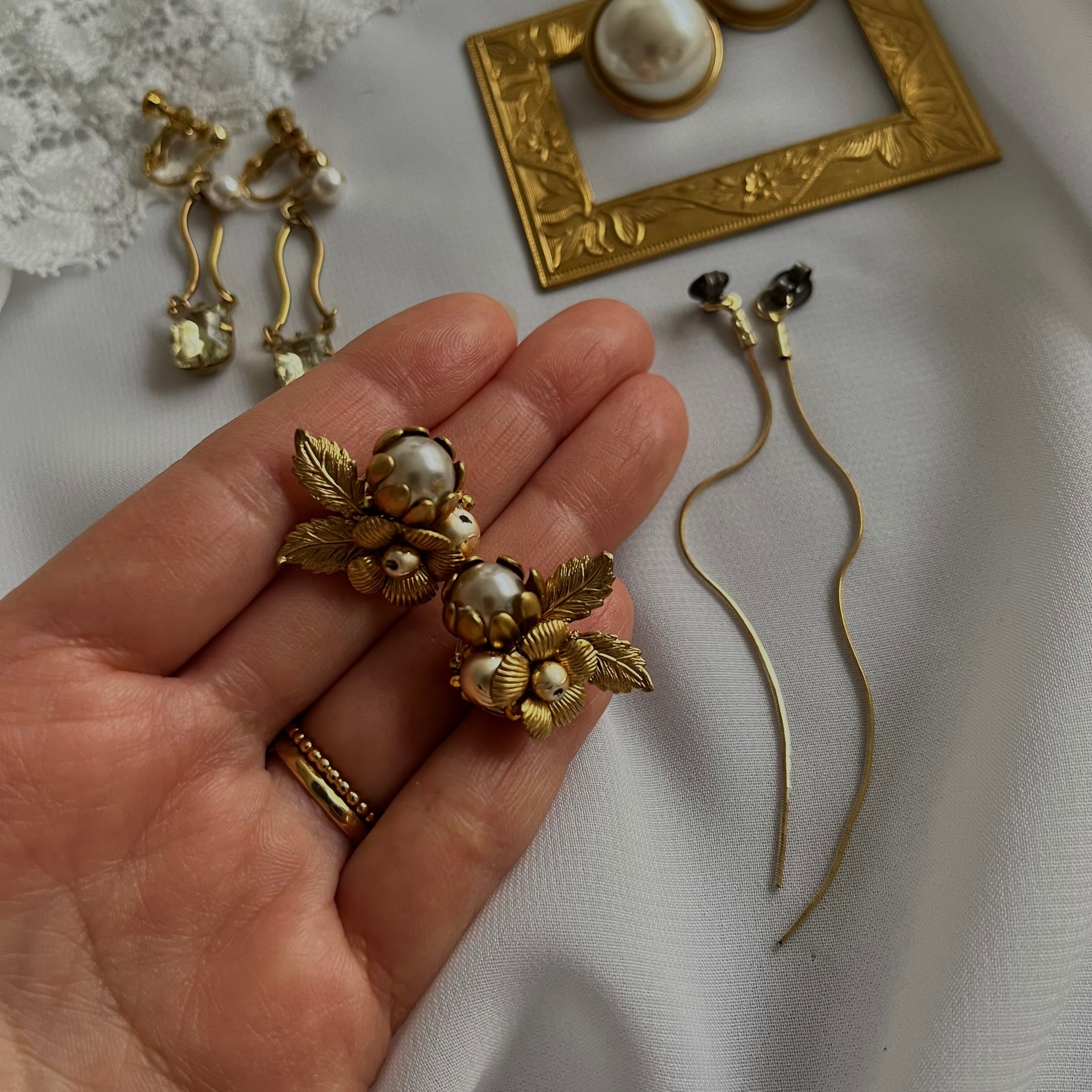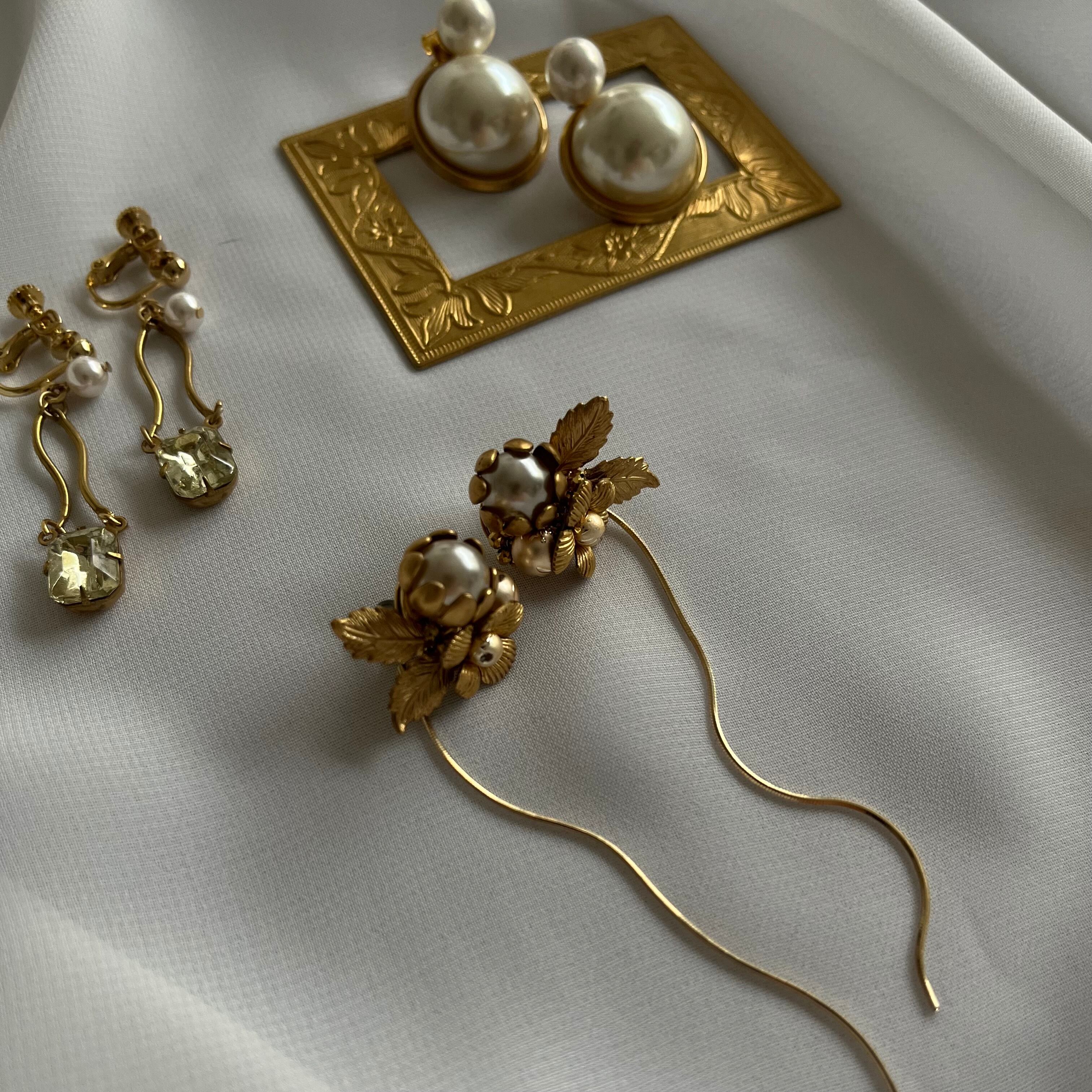 真鍮フラワーやリーフは細かな模様が繊細で美しく、柔らかな光沢を持つヴィンテージ パールやゴールドビーズが加えて、華やかさをプラスしました。