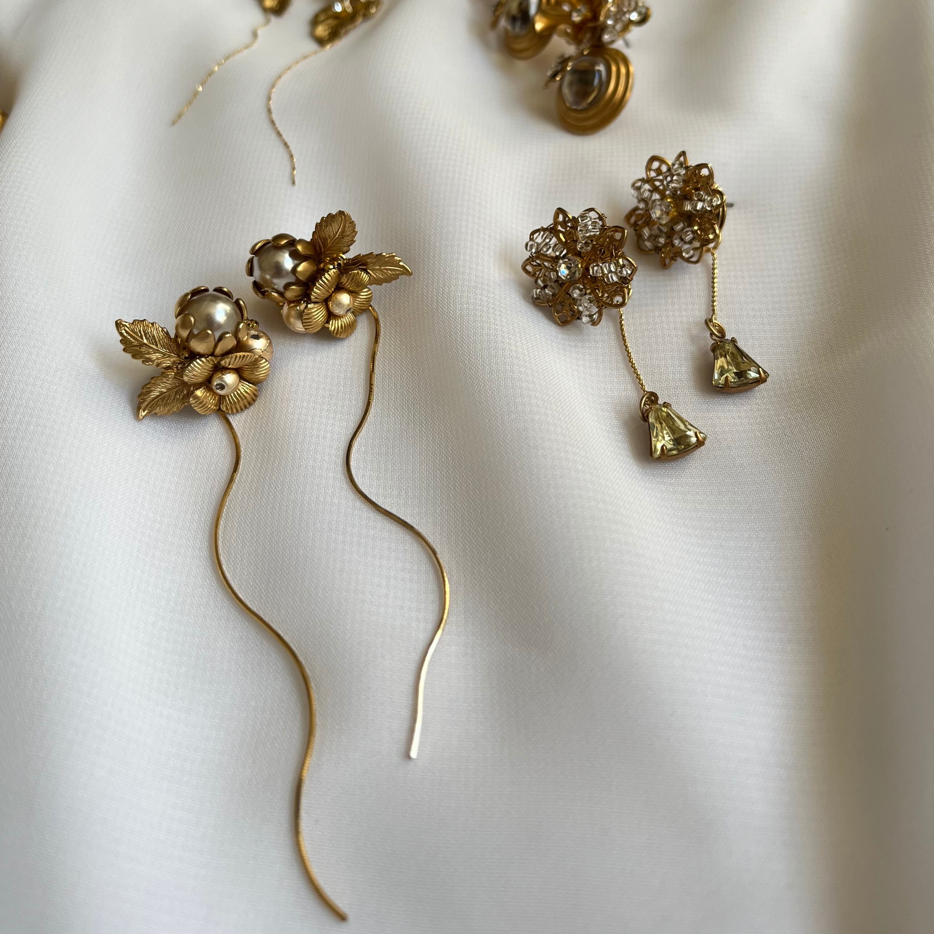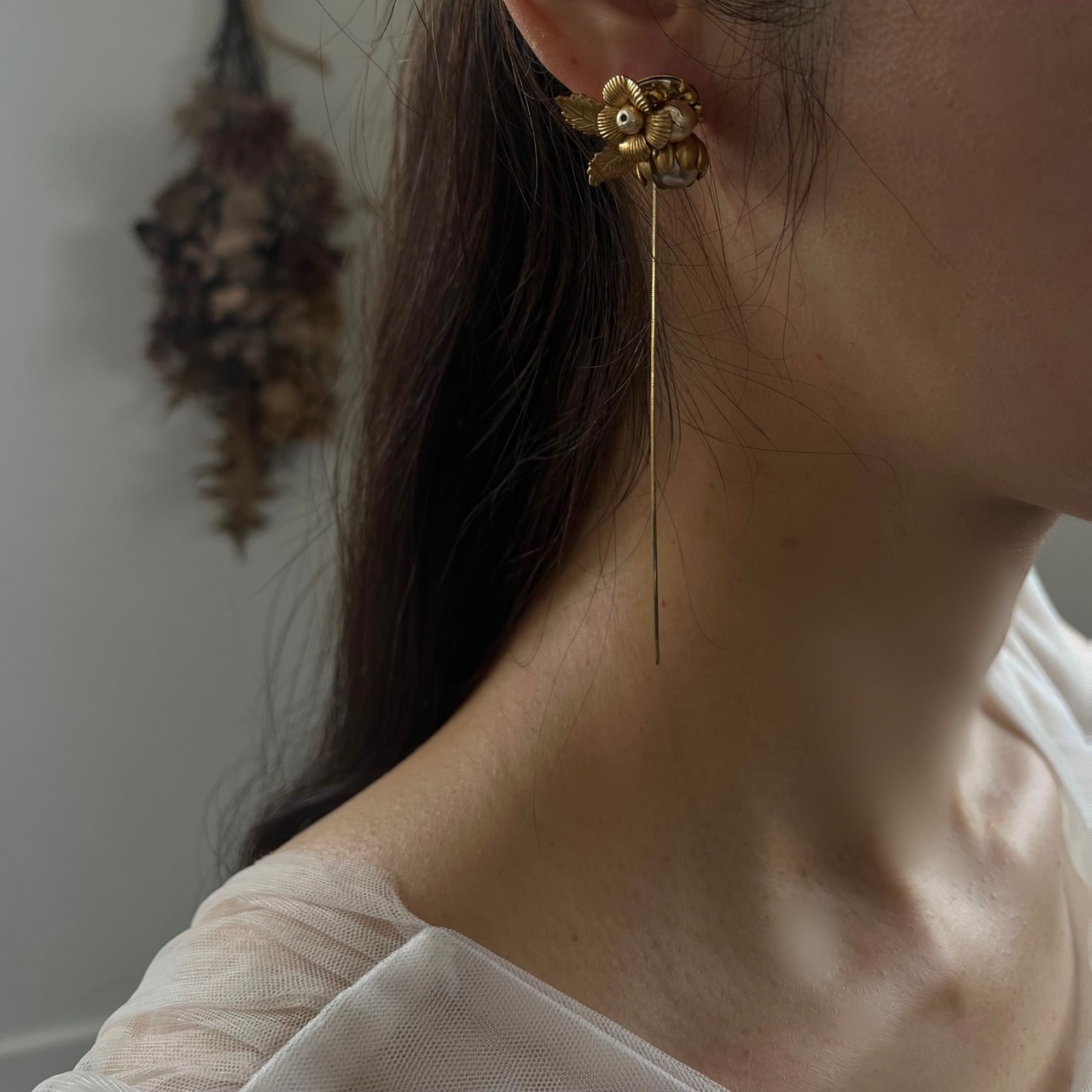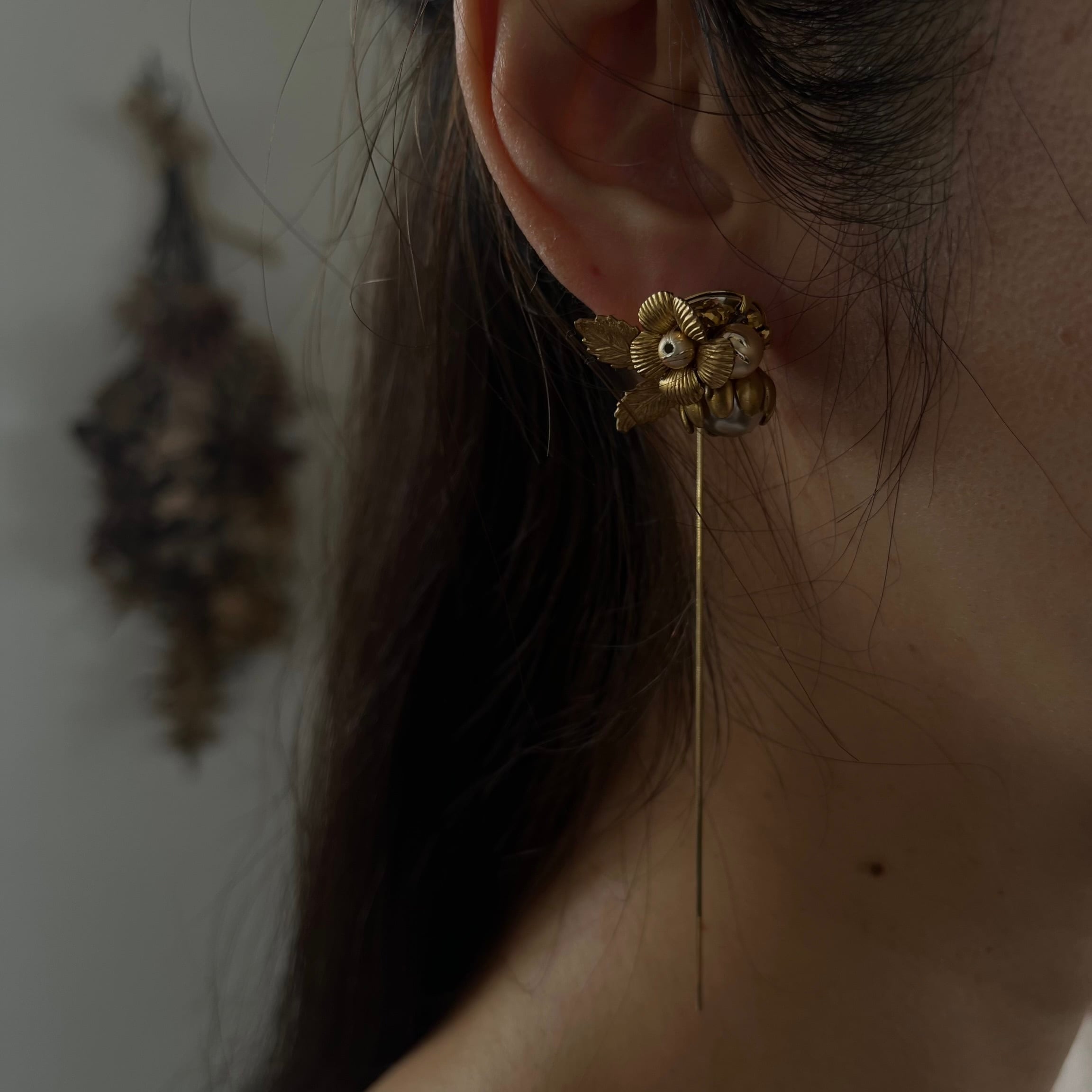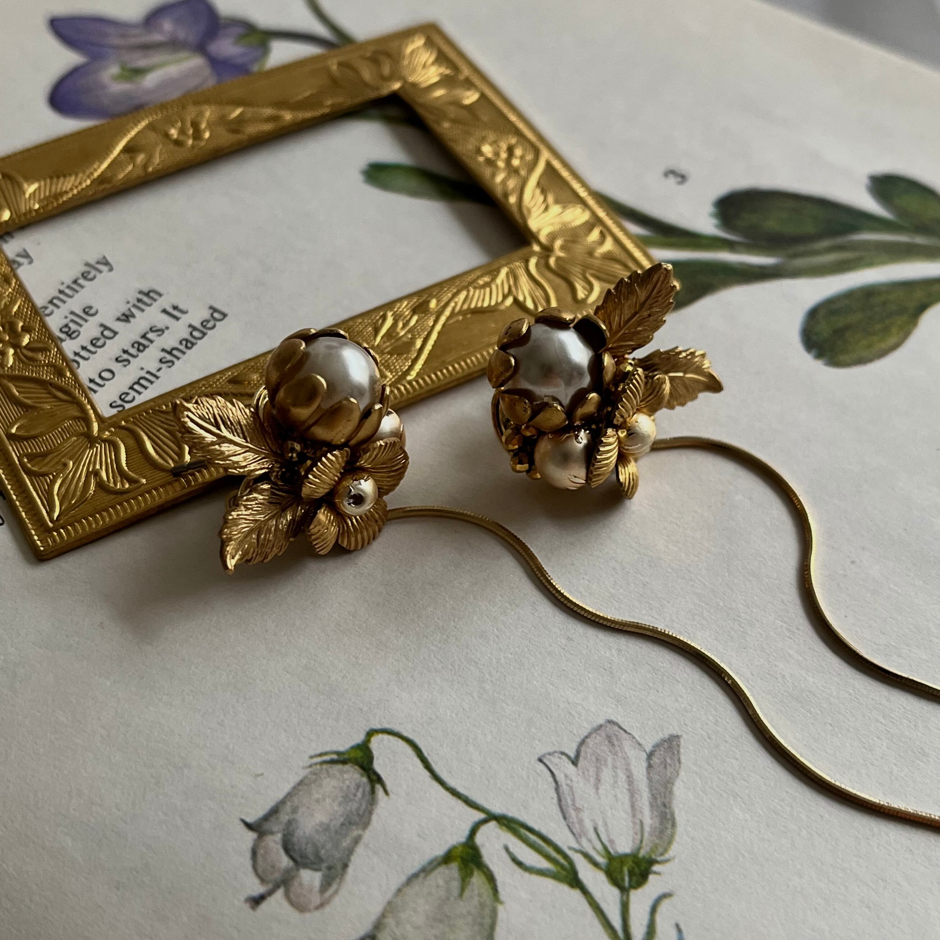 美しい真鍮の小花やリーフ、ヴィンテージ パールを小さなブーケのように編み込み、ロングチェーンを組み合わせたピアス(イヤリング)。