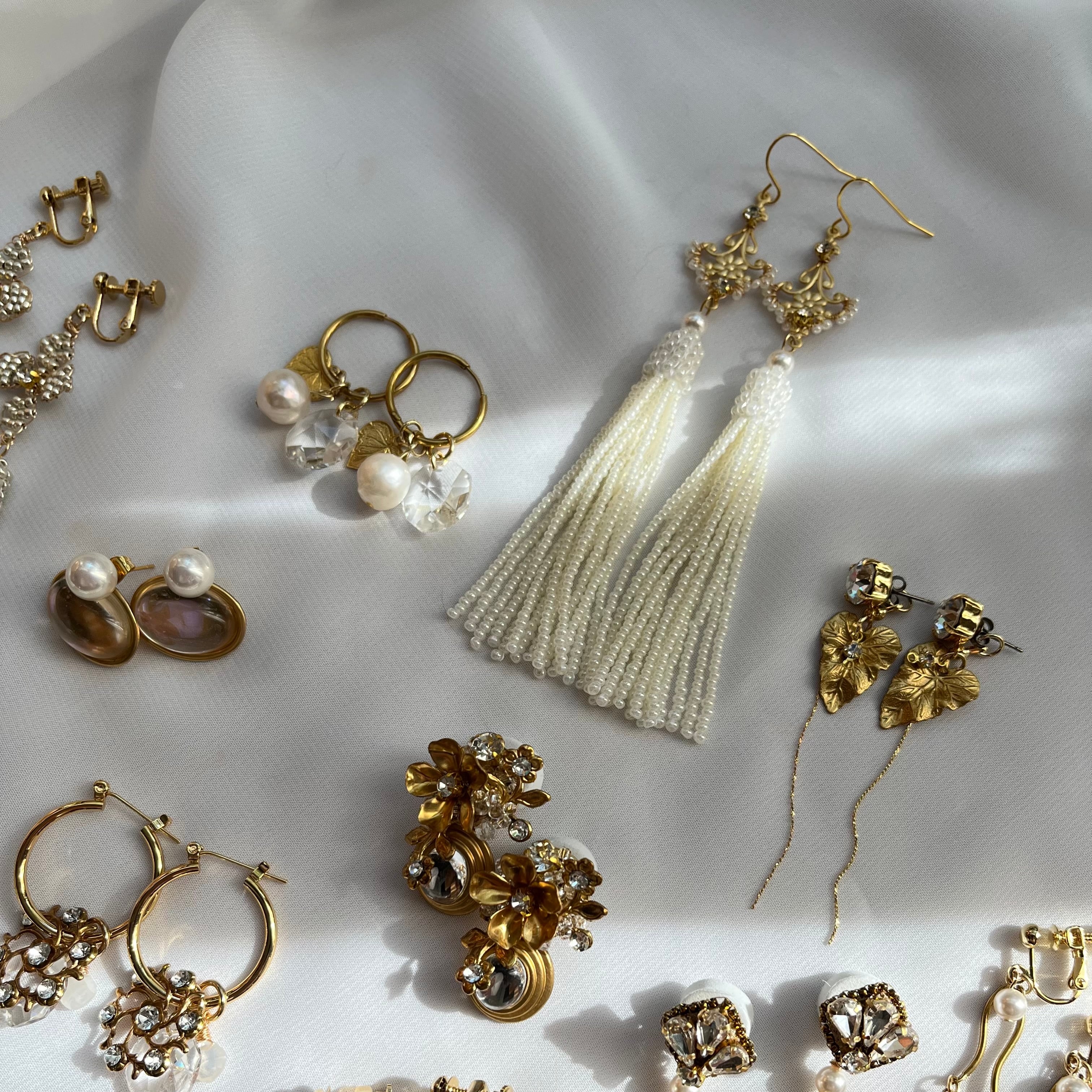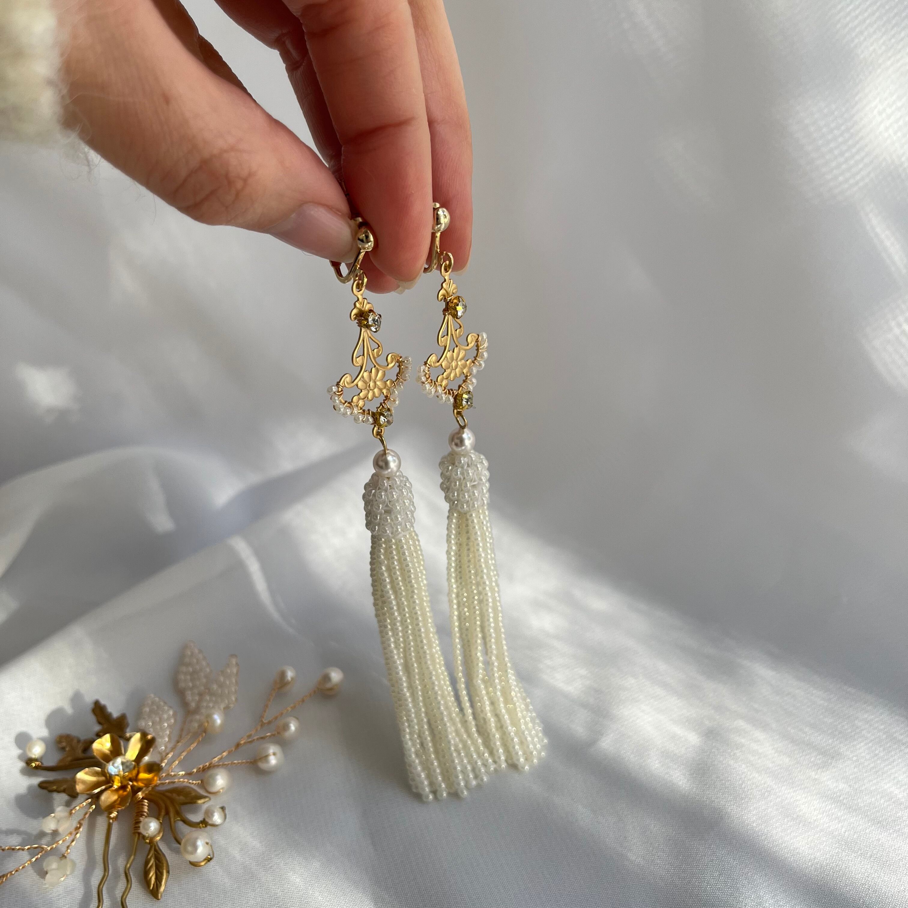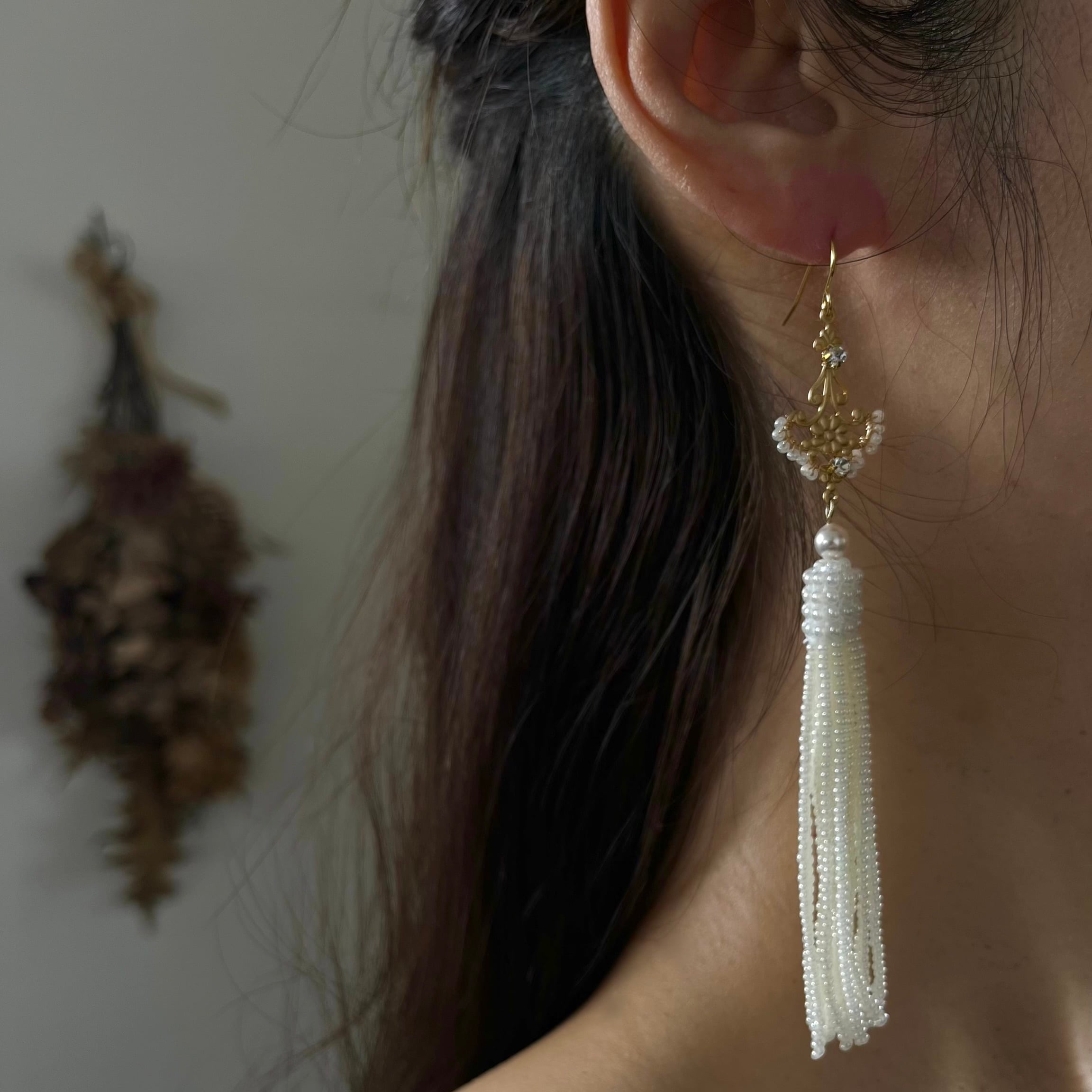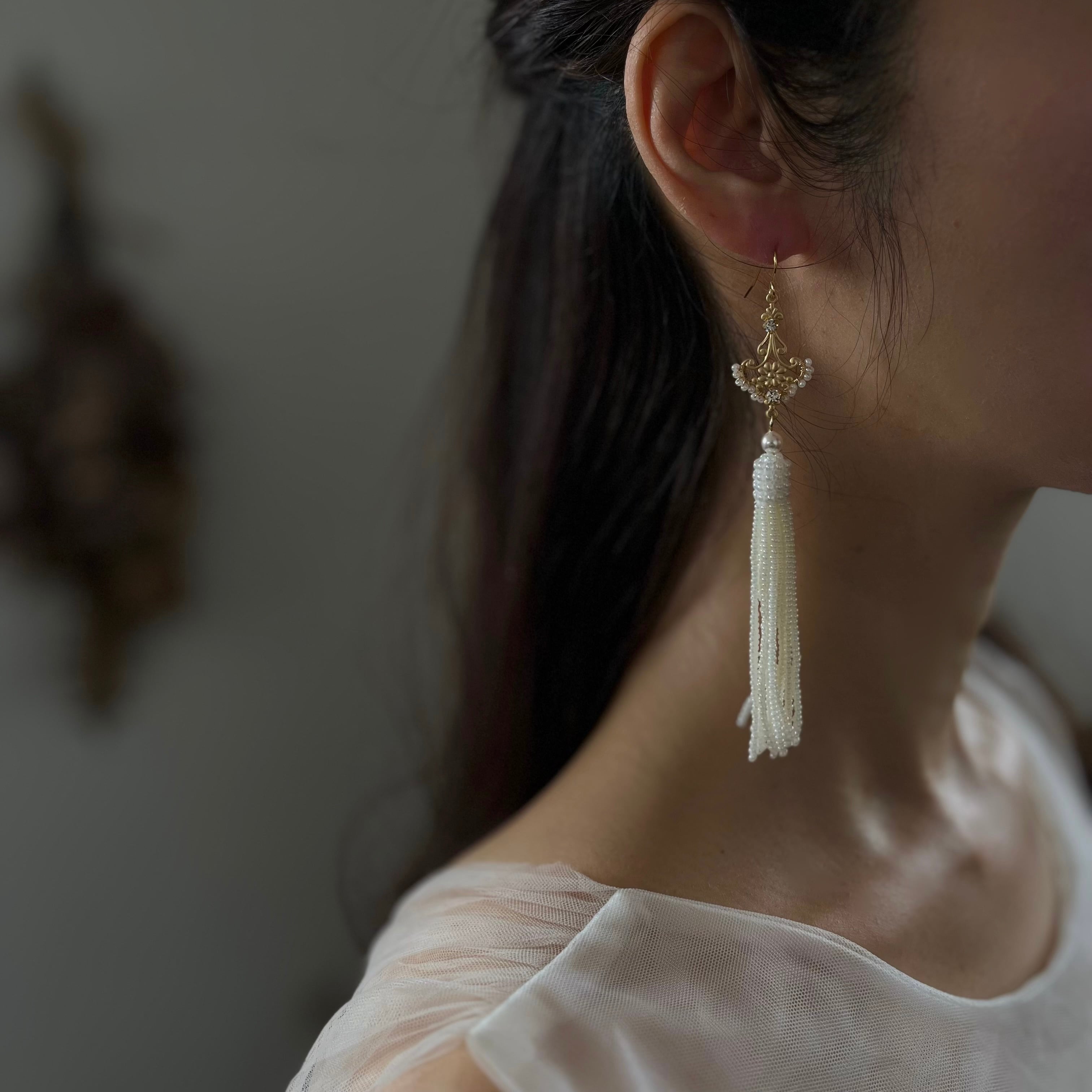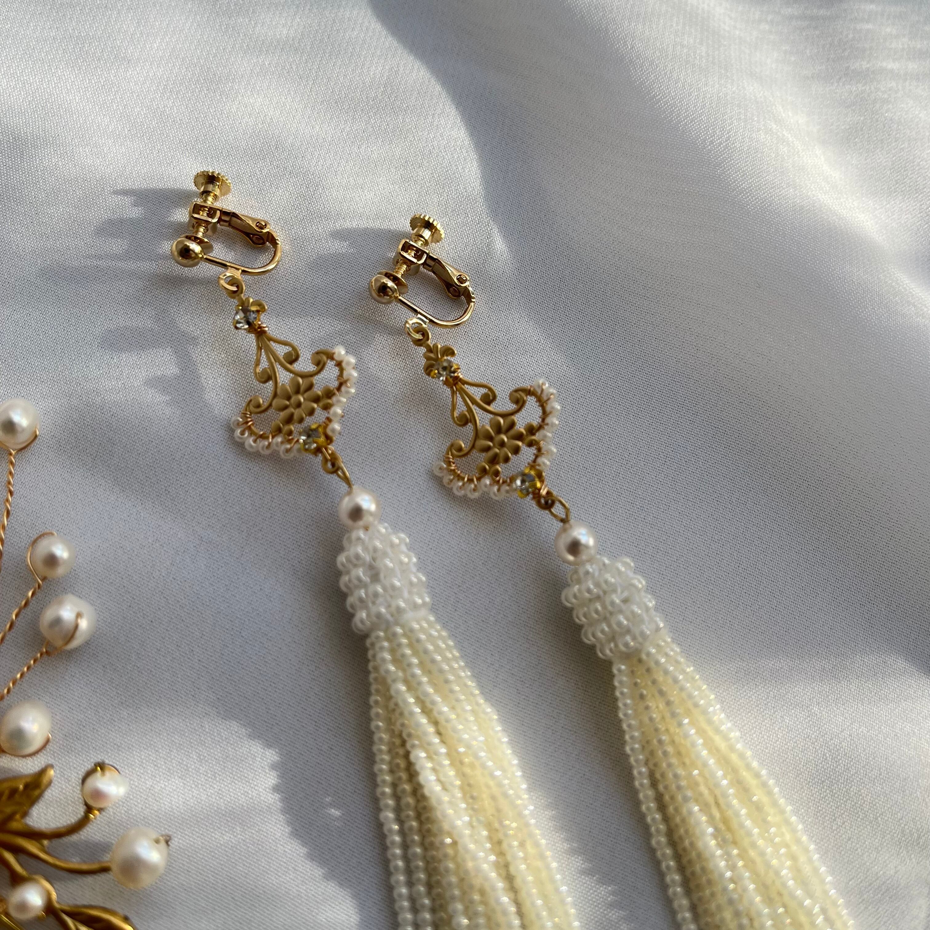 ビーズタッセルは人気のパールオフホワイトカラー。小さなシードビーズを針で束ねるように丁寧にひとつひとつお作りしています。