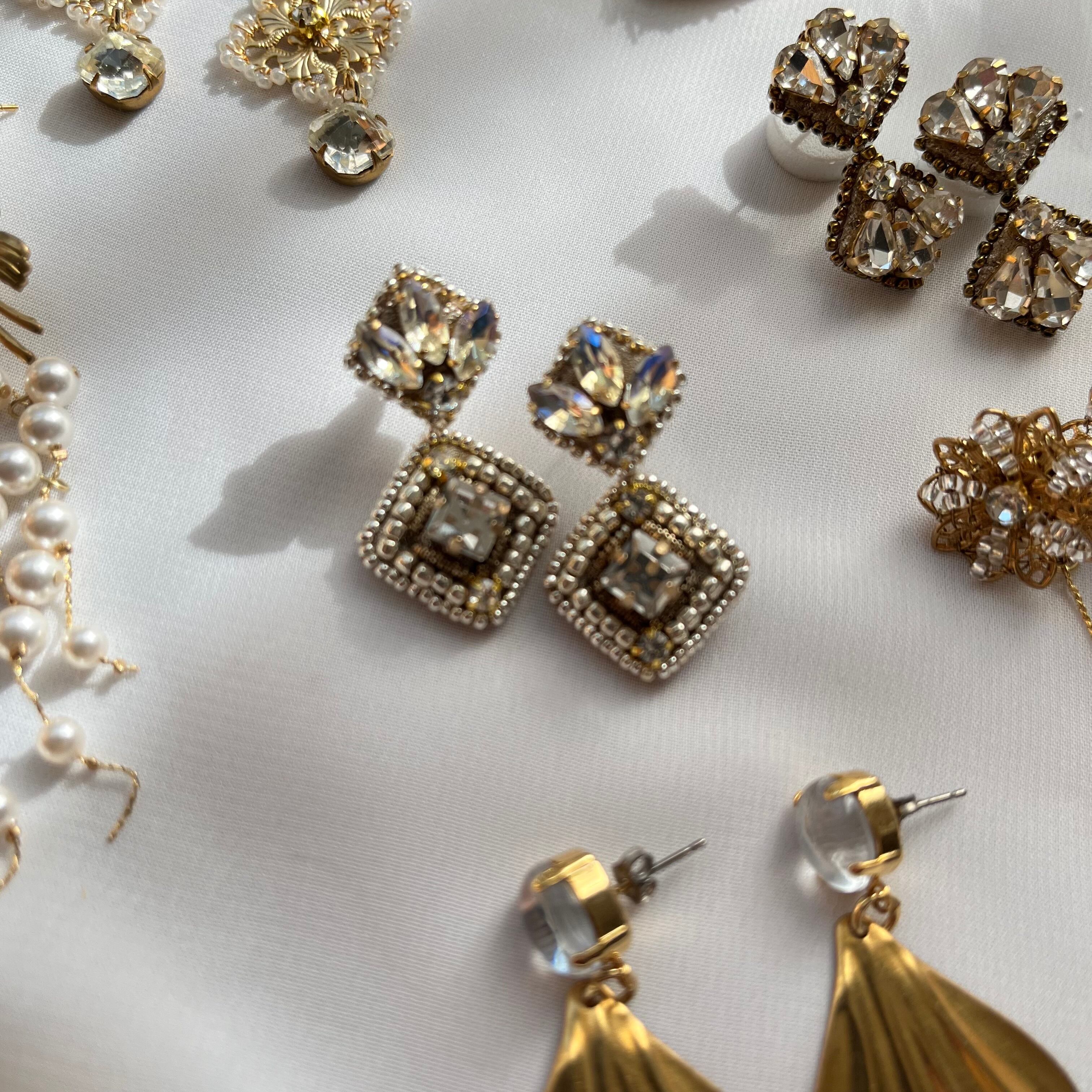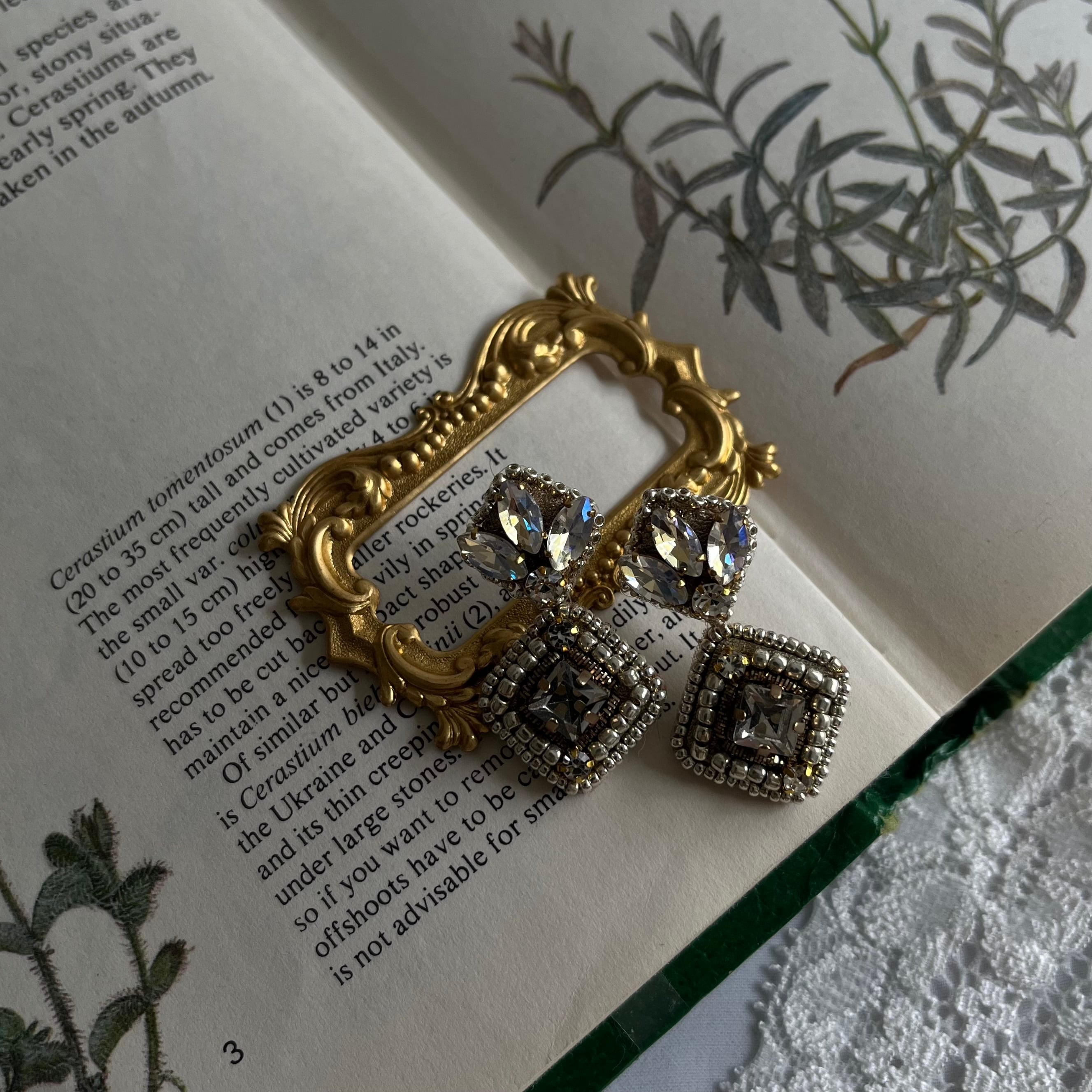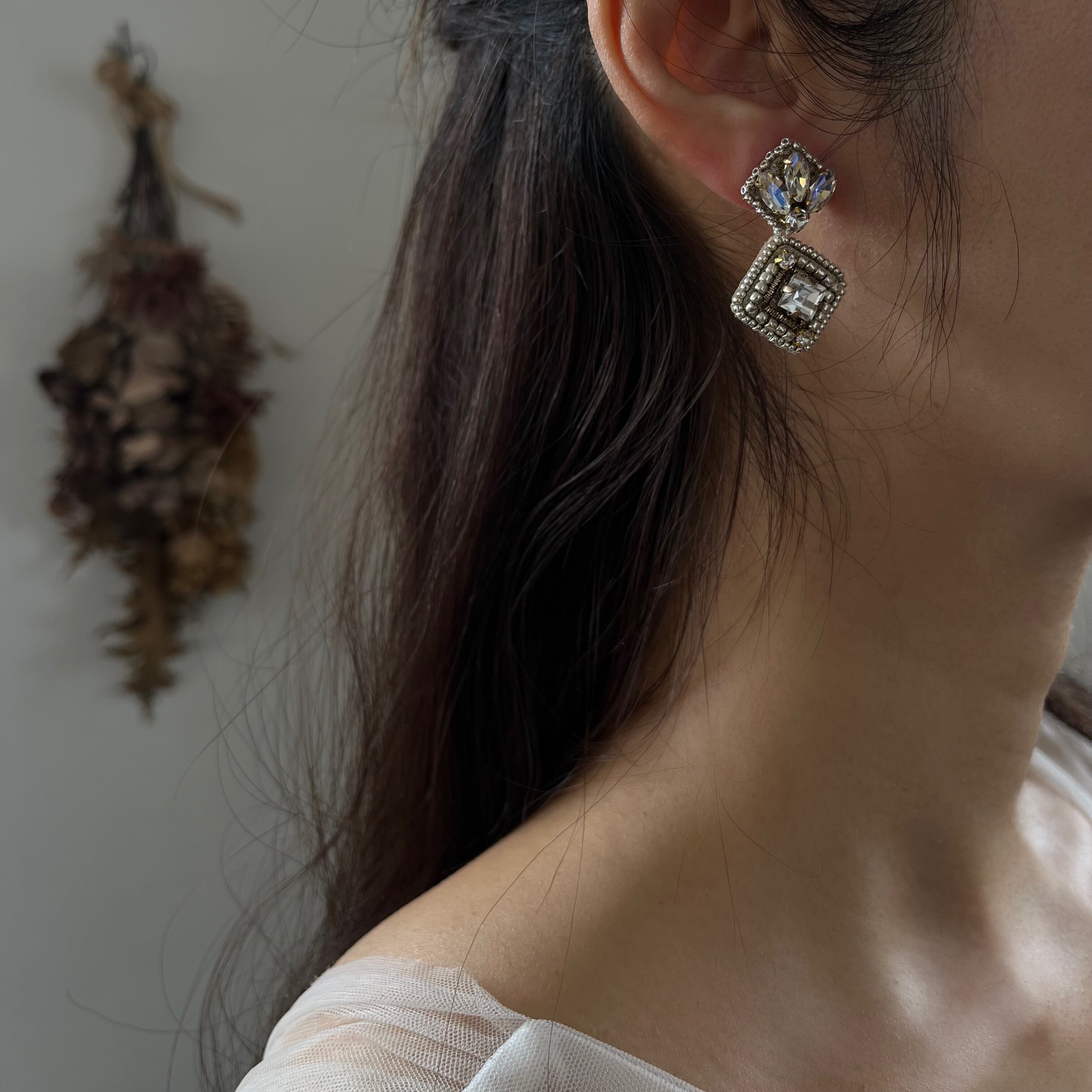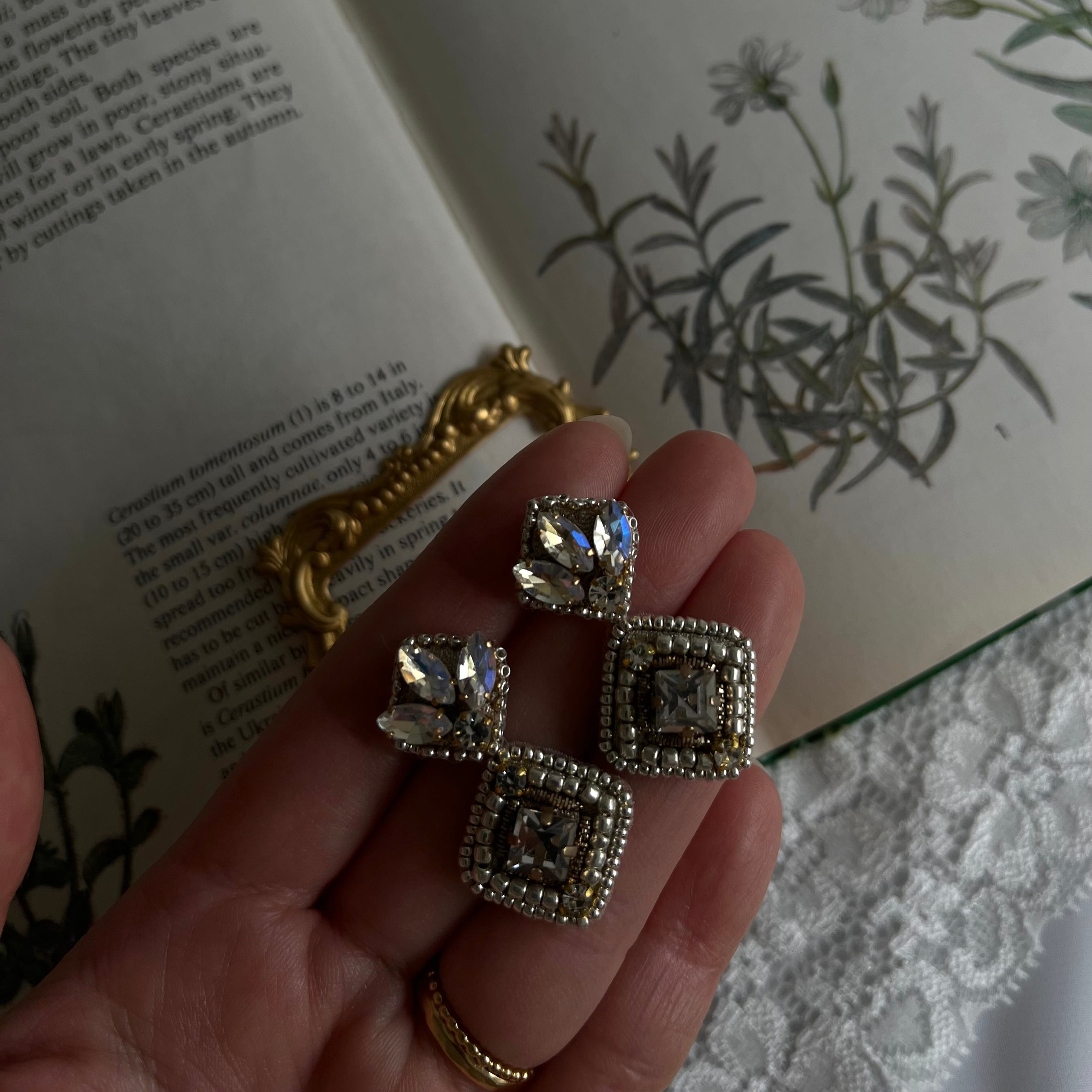 小さなガラスストーンや極小ビーズを散りばめた大小のスクエアモチーフを連ねたピアス(イヤリング)。