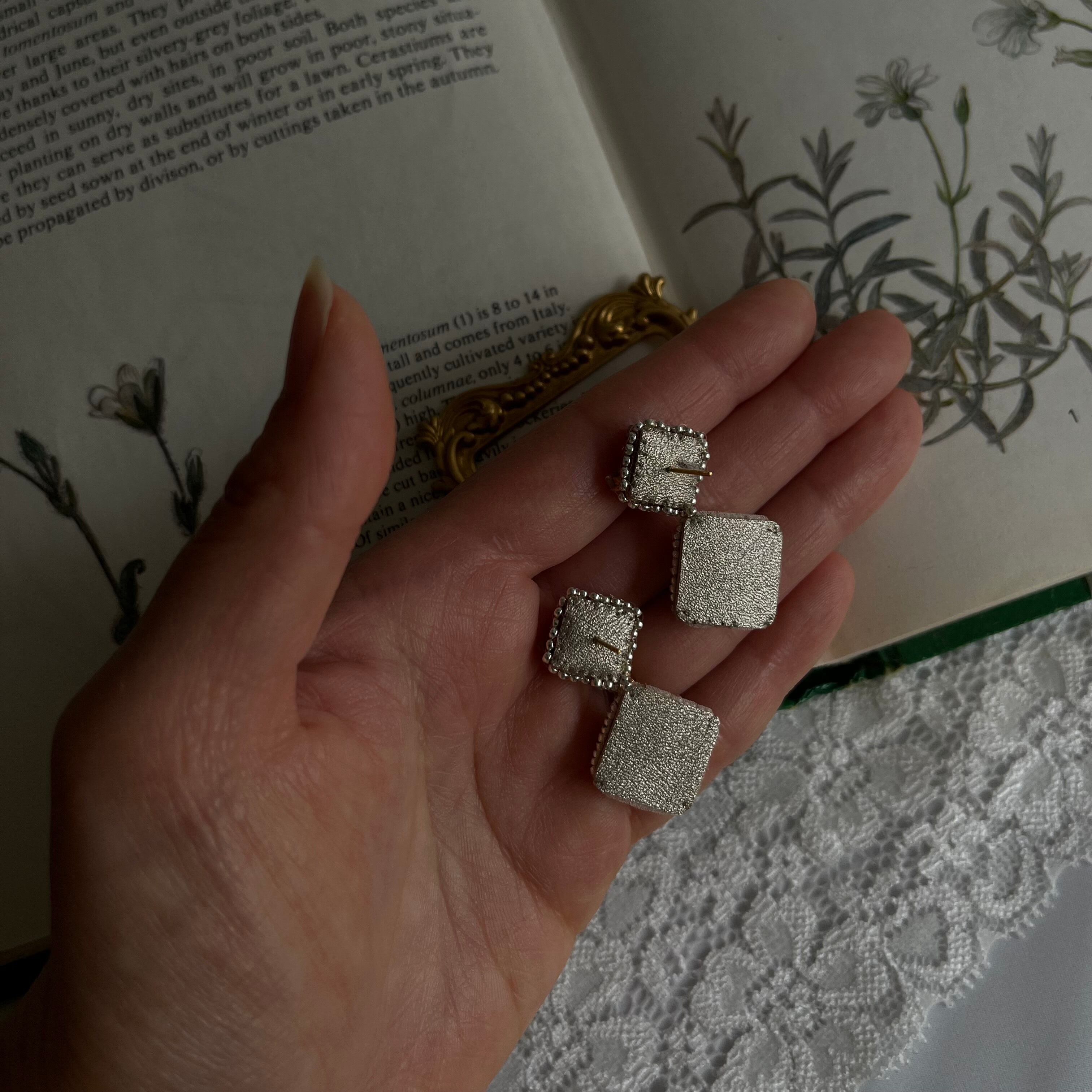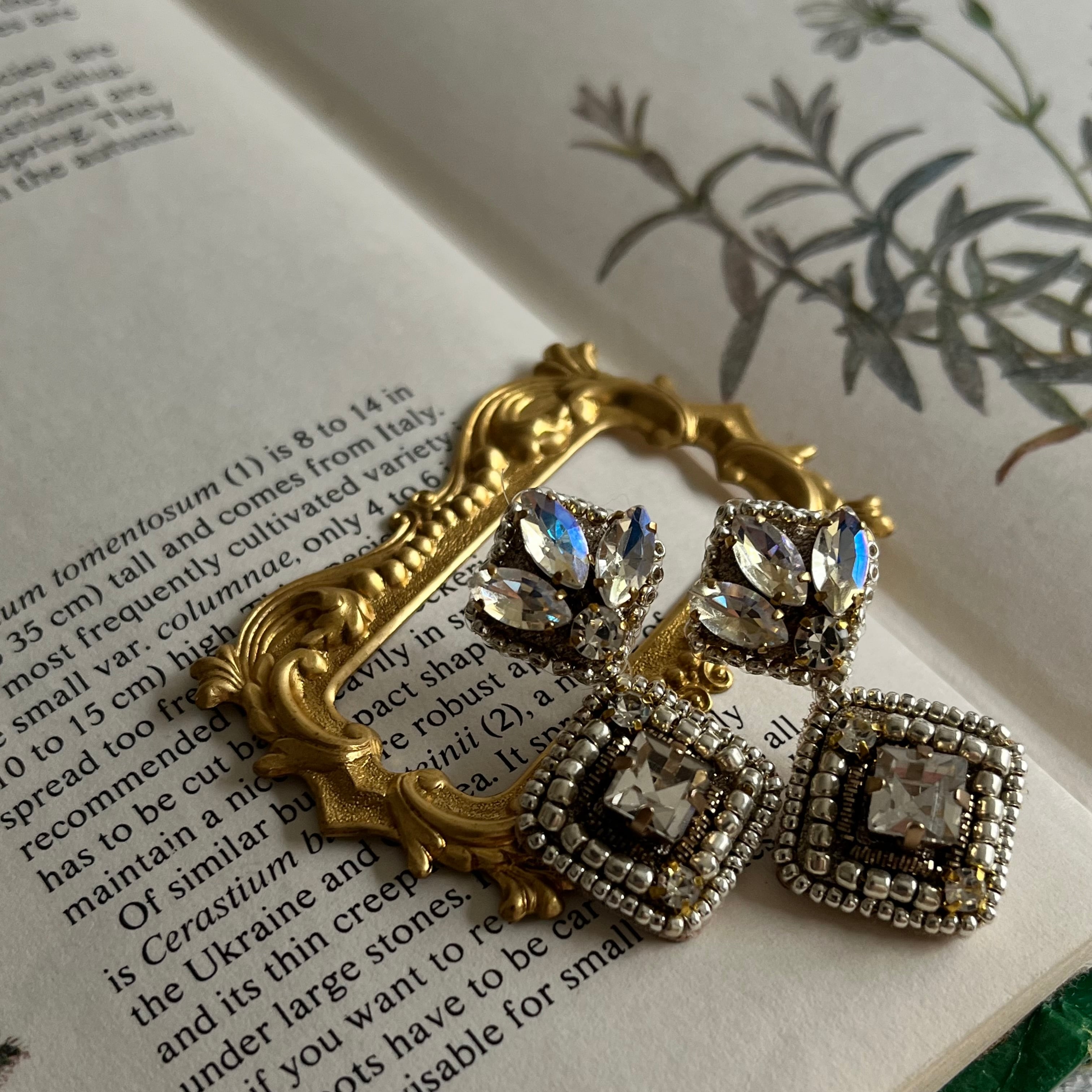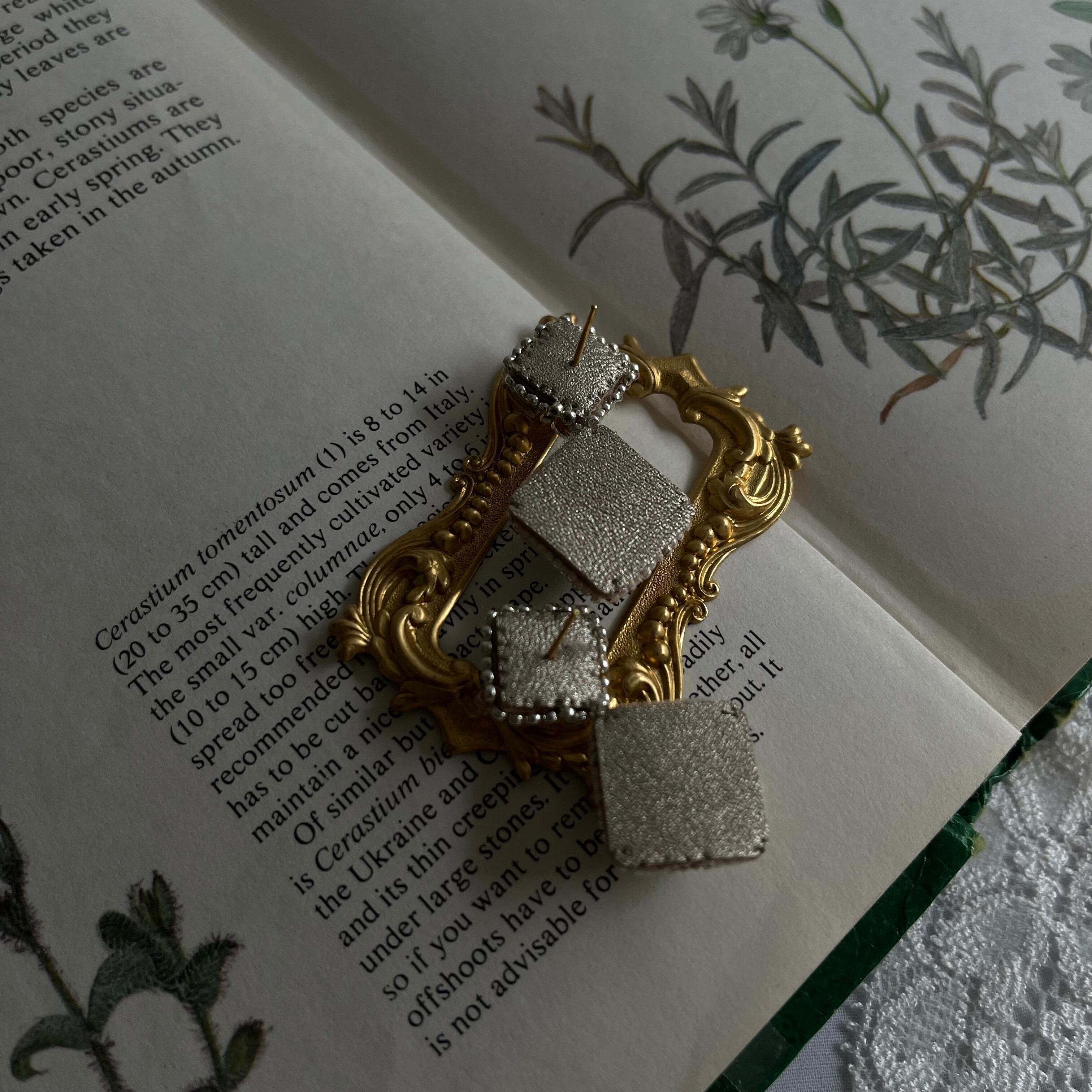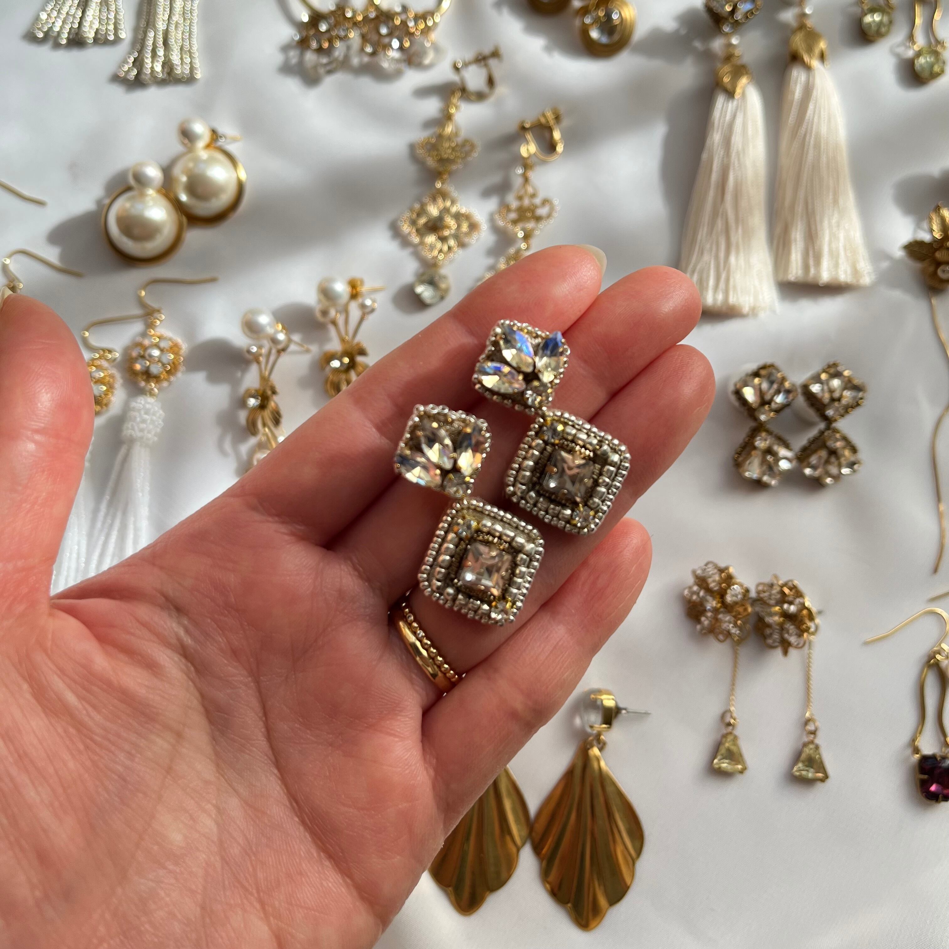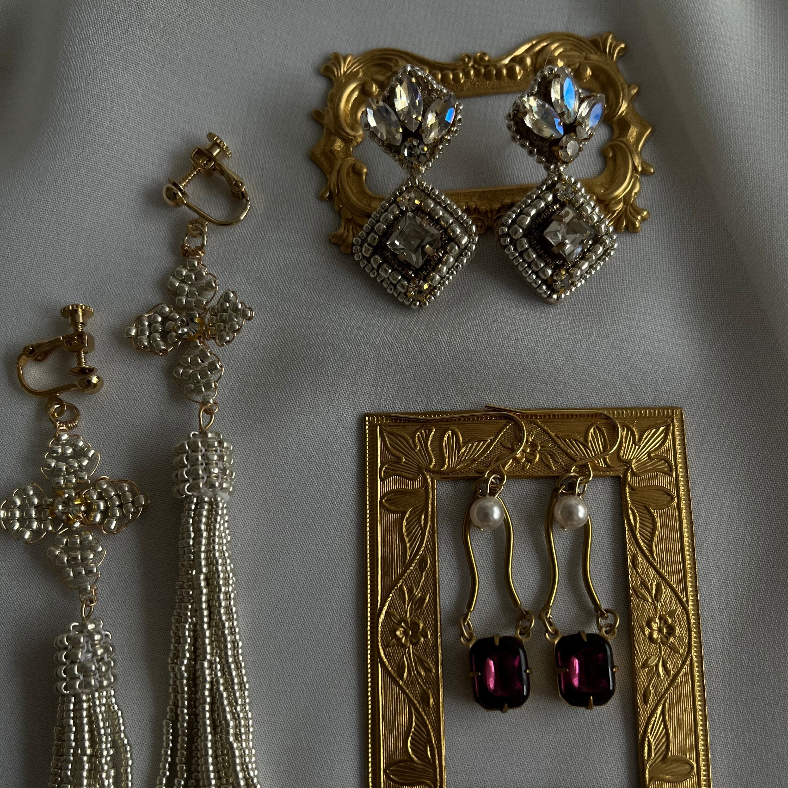 小さなガラスストーンや極小ビーズを散りばめた大小のスクエアモチーフを連ねたピアス(イヤリング)。