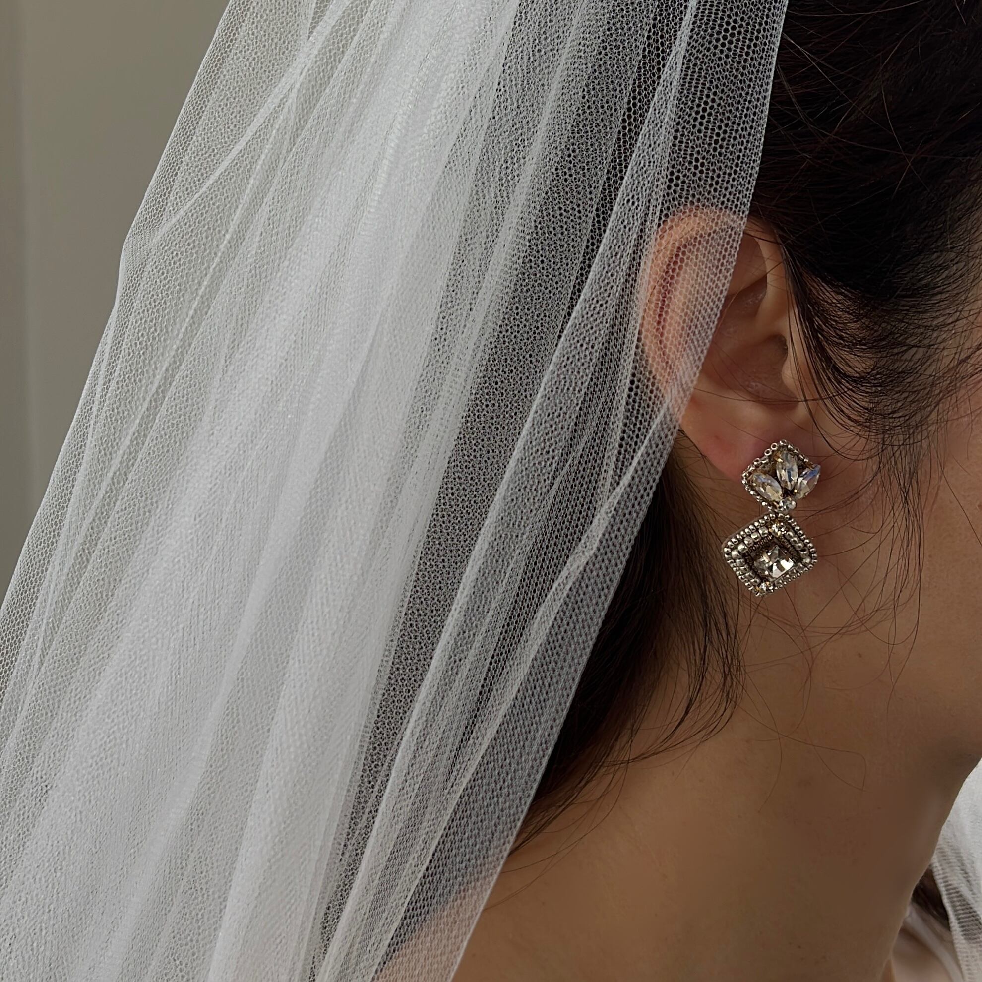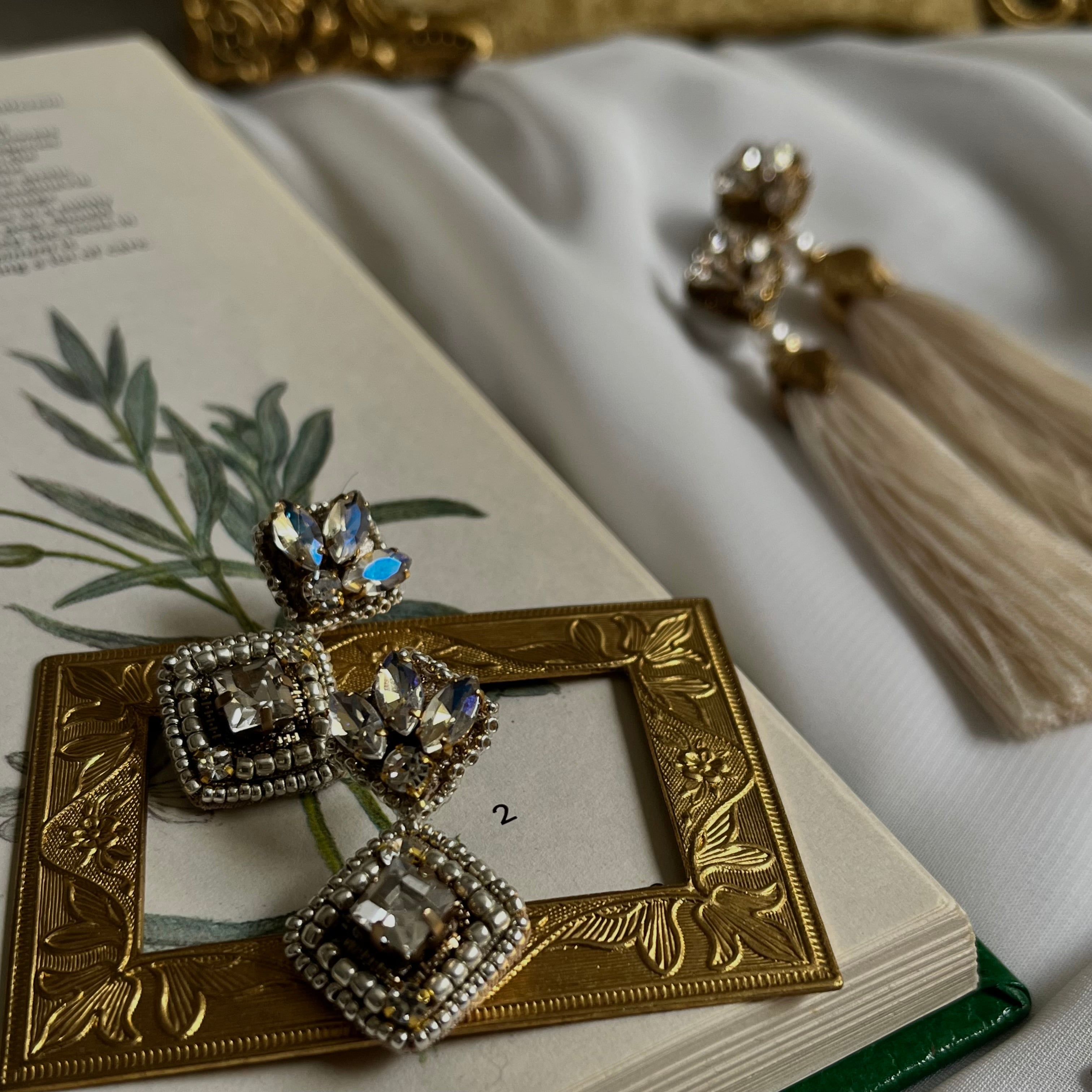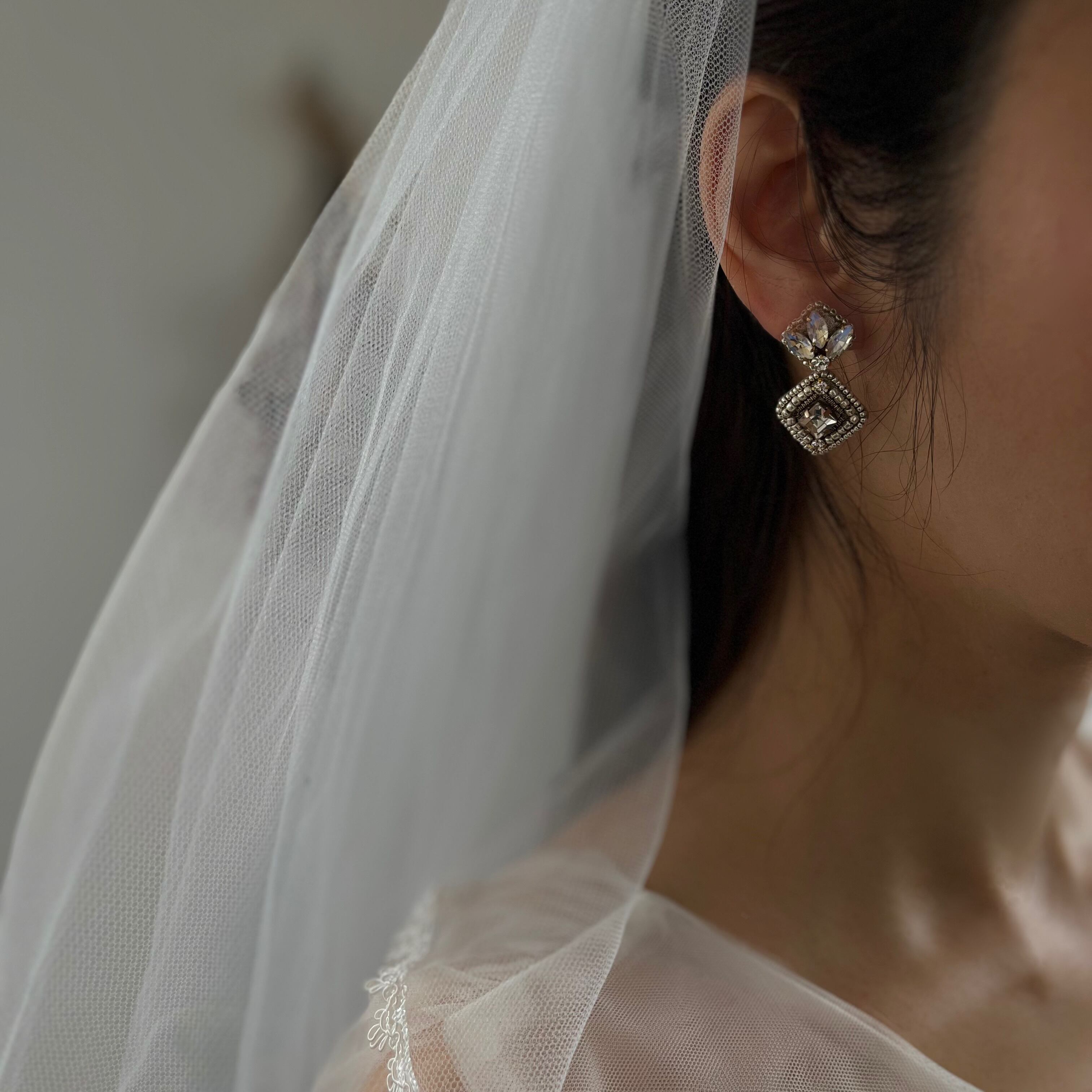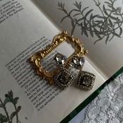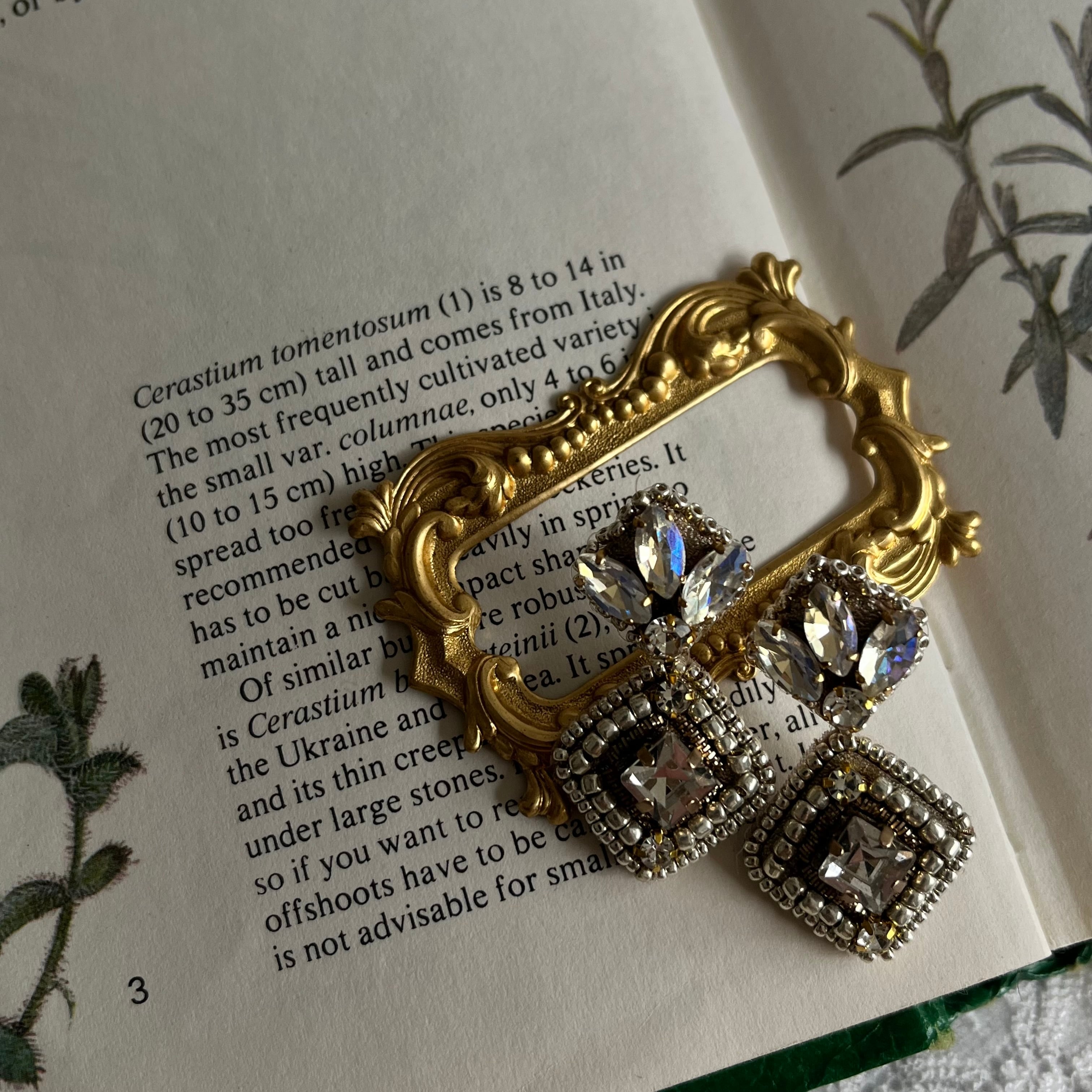 小さなガラスストーンや極小ビーズを散りばめた大小のスクエアモチーフを連ねたピアス(イヤリング)。