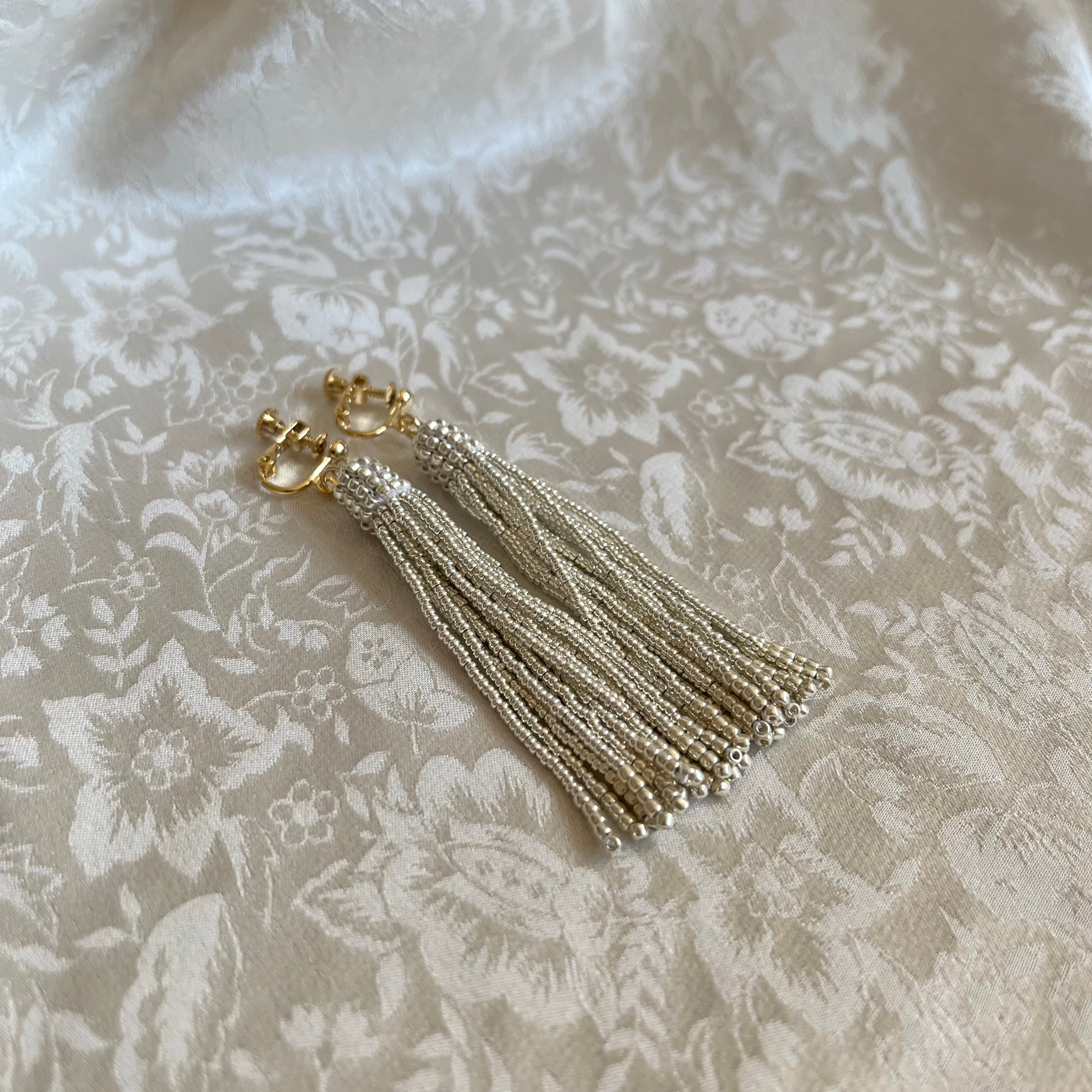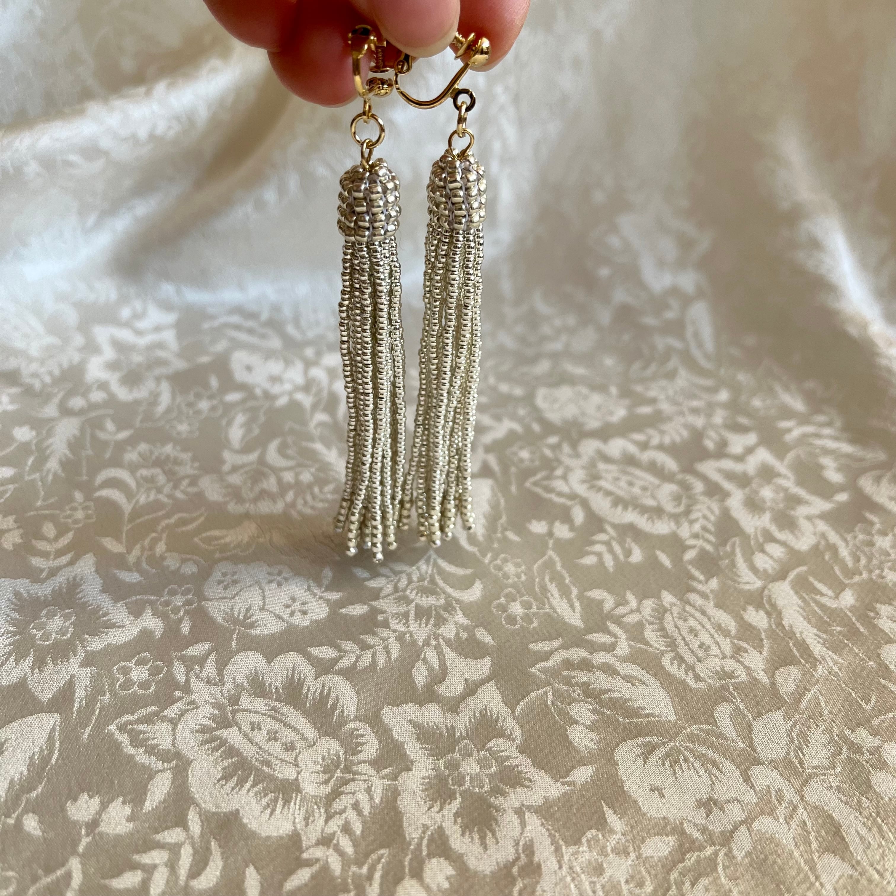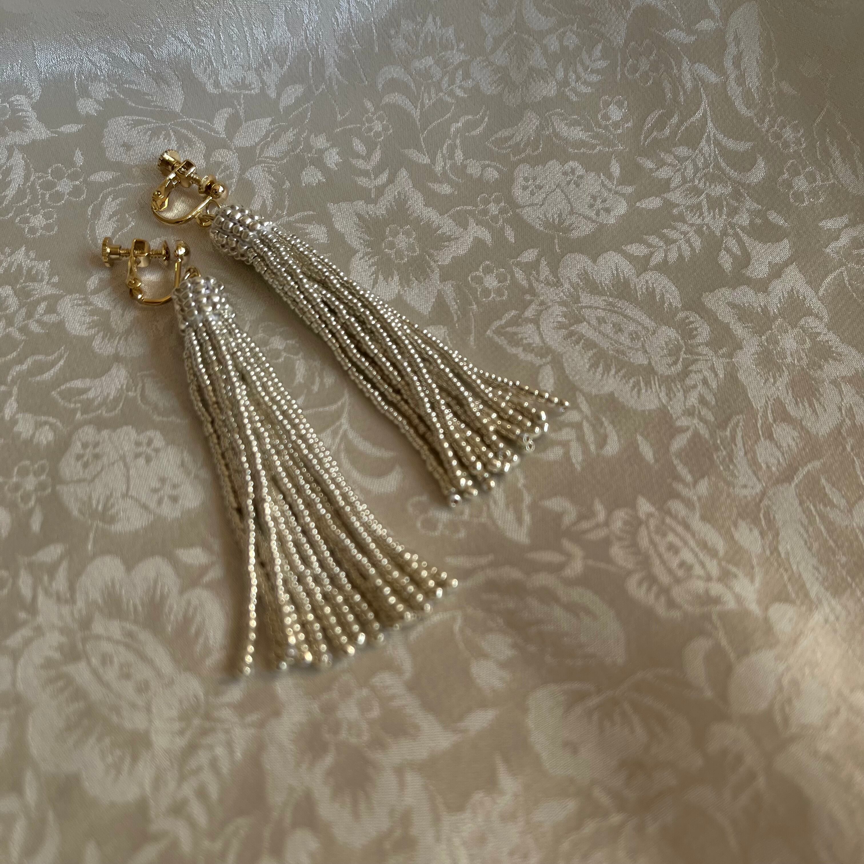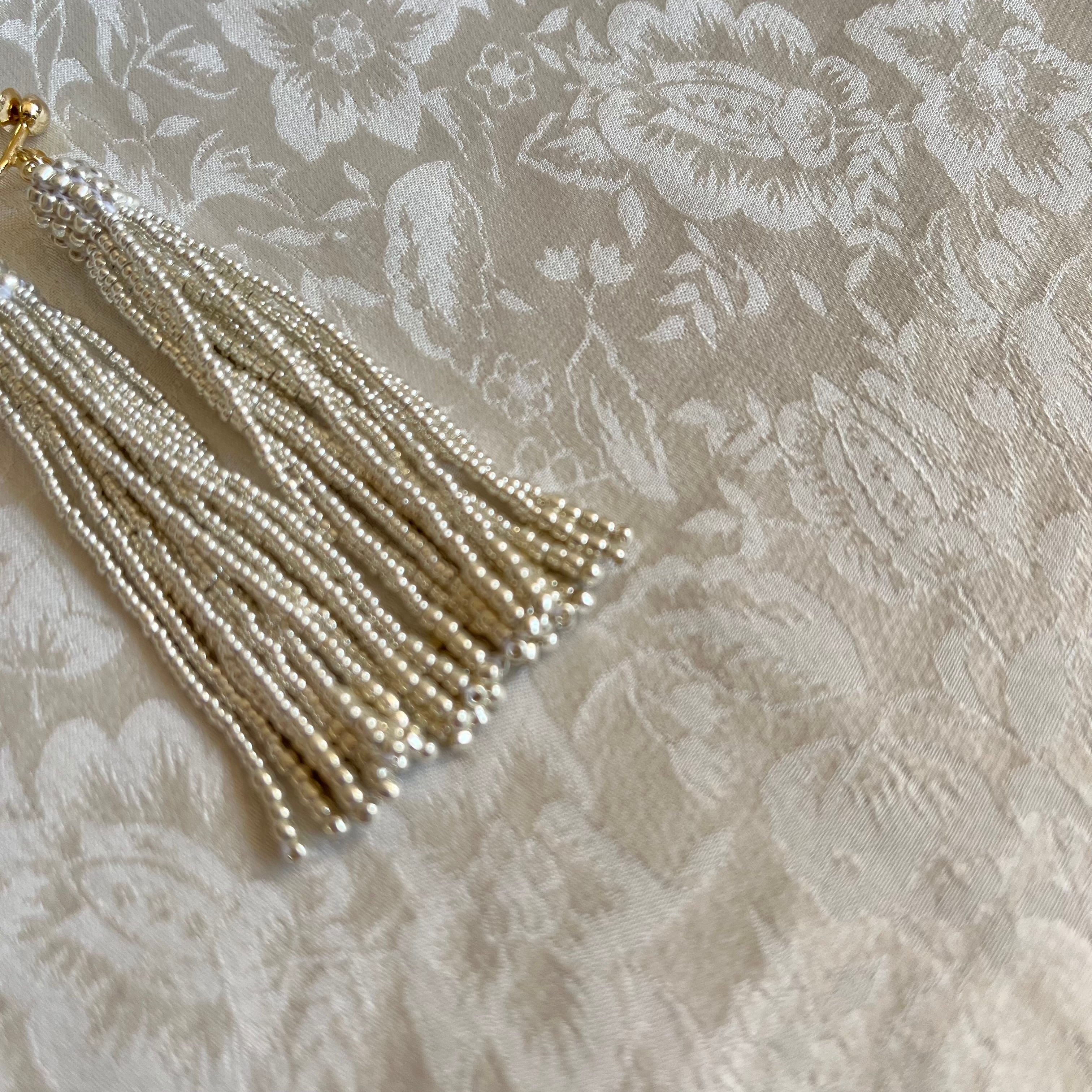 タッセル部分がしなやかな質感になるよう、糸の引き方に注意しながら針で1本ずつ手刺ししてお作りしています。特小サイズのビーズを使用しており、ビーズでも繊細な印象の仕上がりなるようこだわりました。