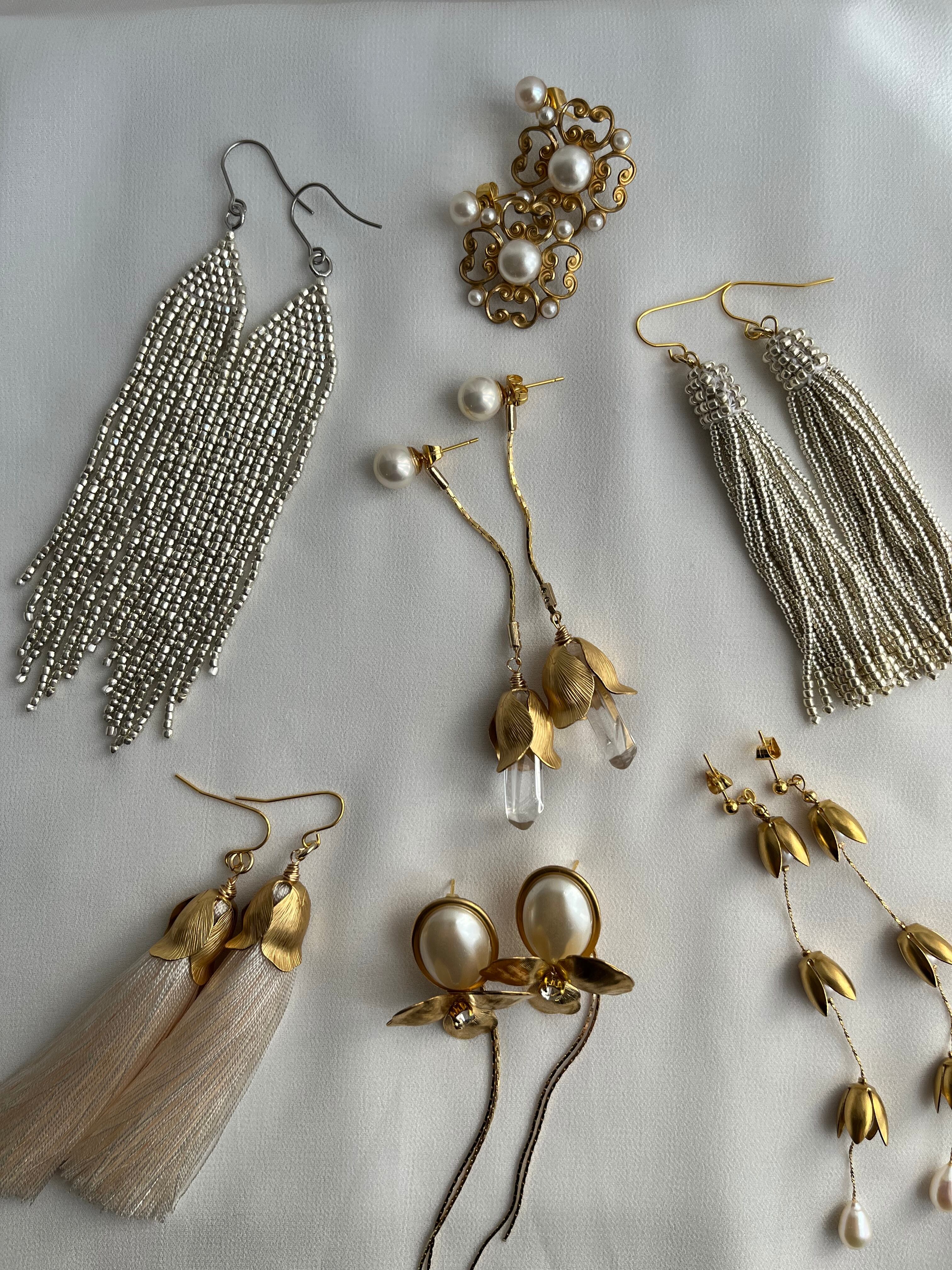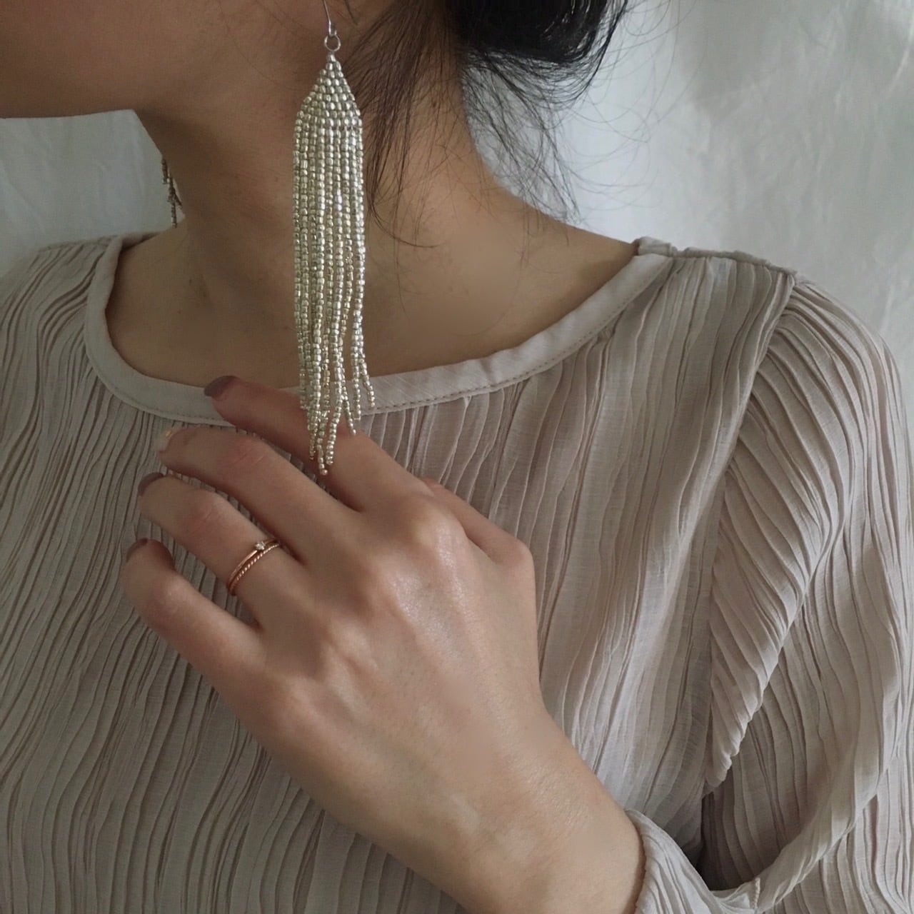 美しいシルバーカラーのビーズを丁寧に編み込みお作りした人気のビーズフリンジピアス(イヤリング)。高品質なシルバービーズにはカットが施され、揺れる度にキラキラと輝きます。