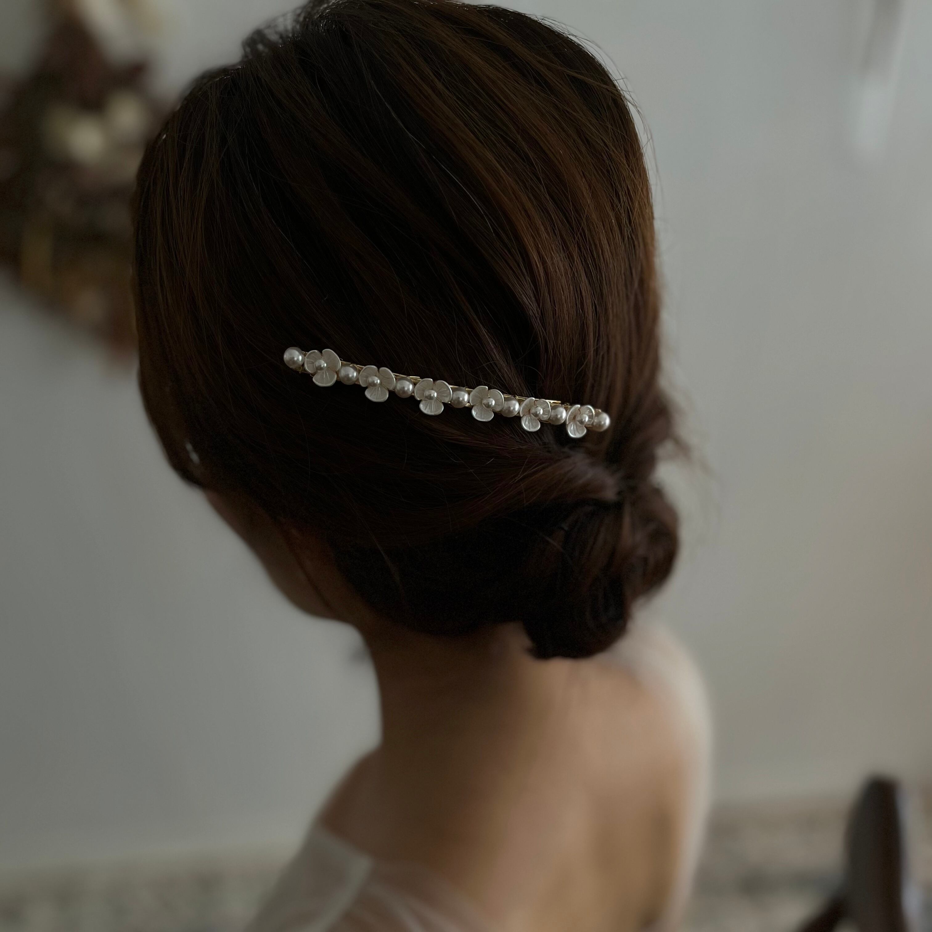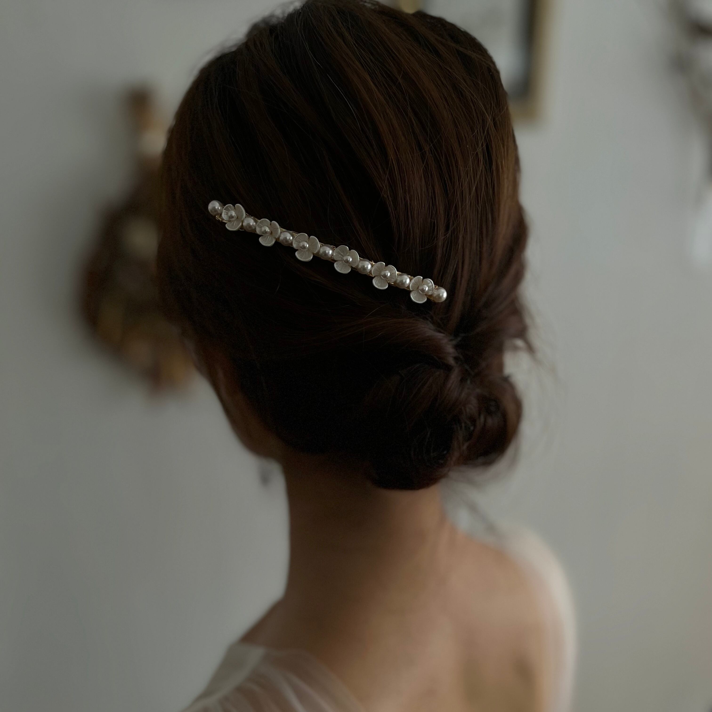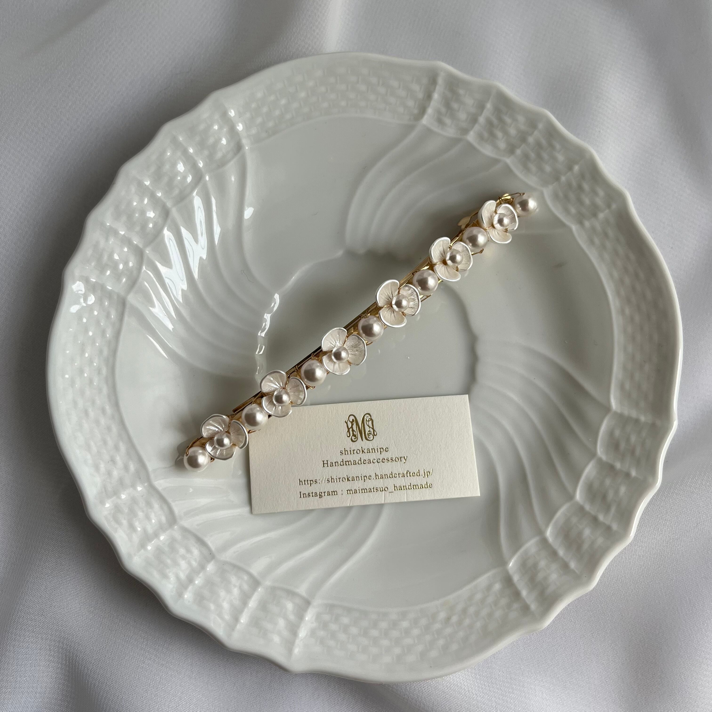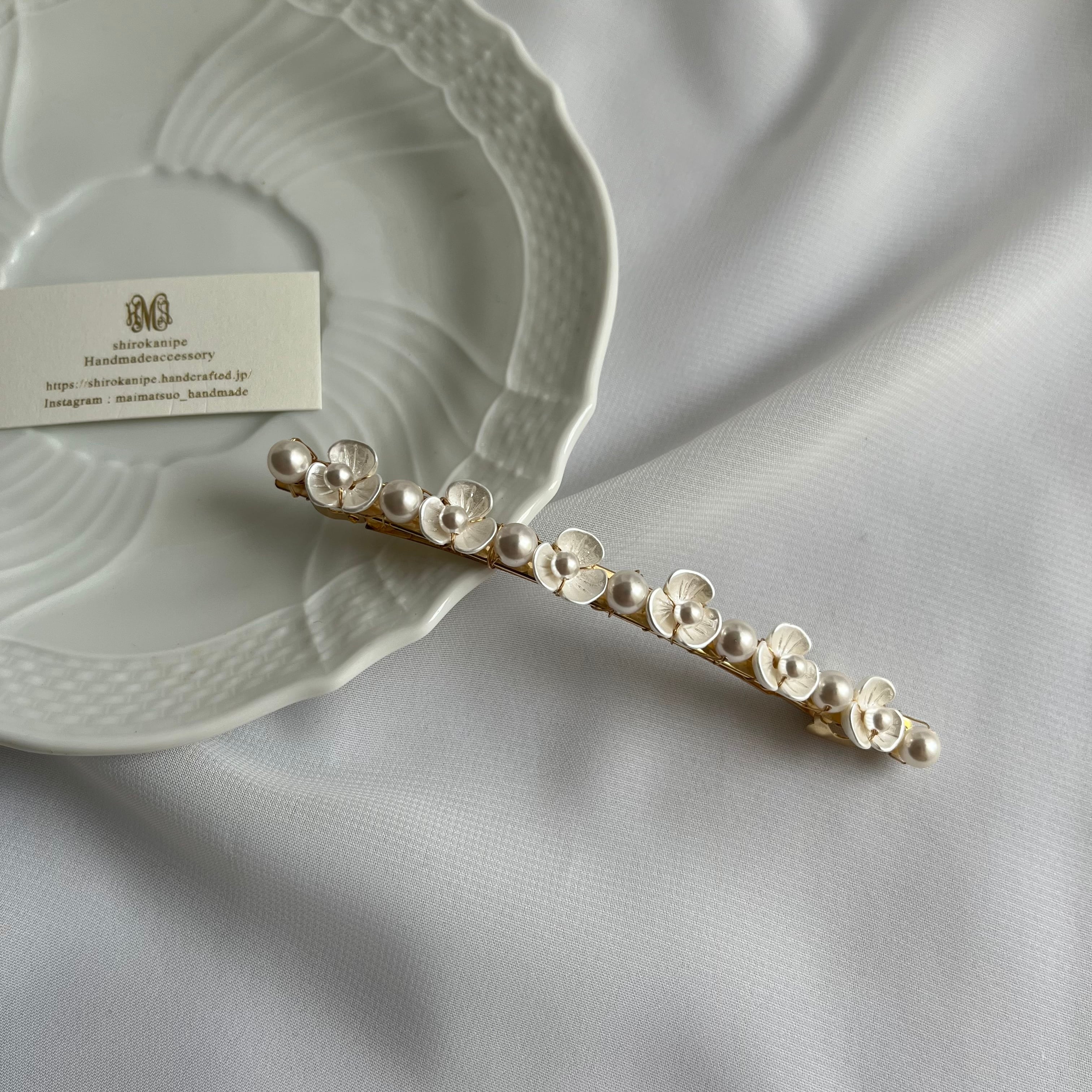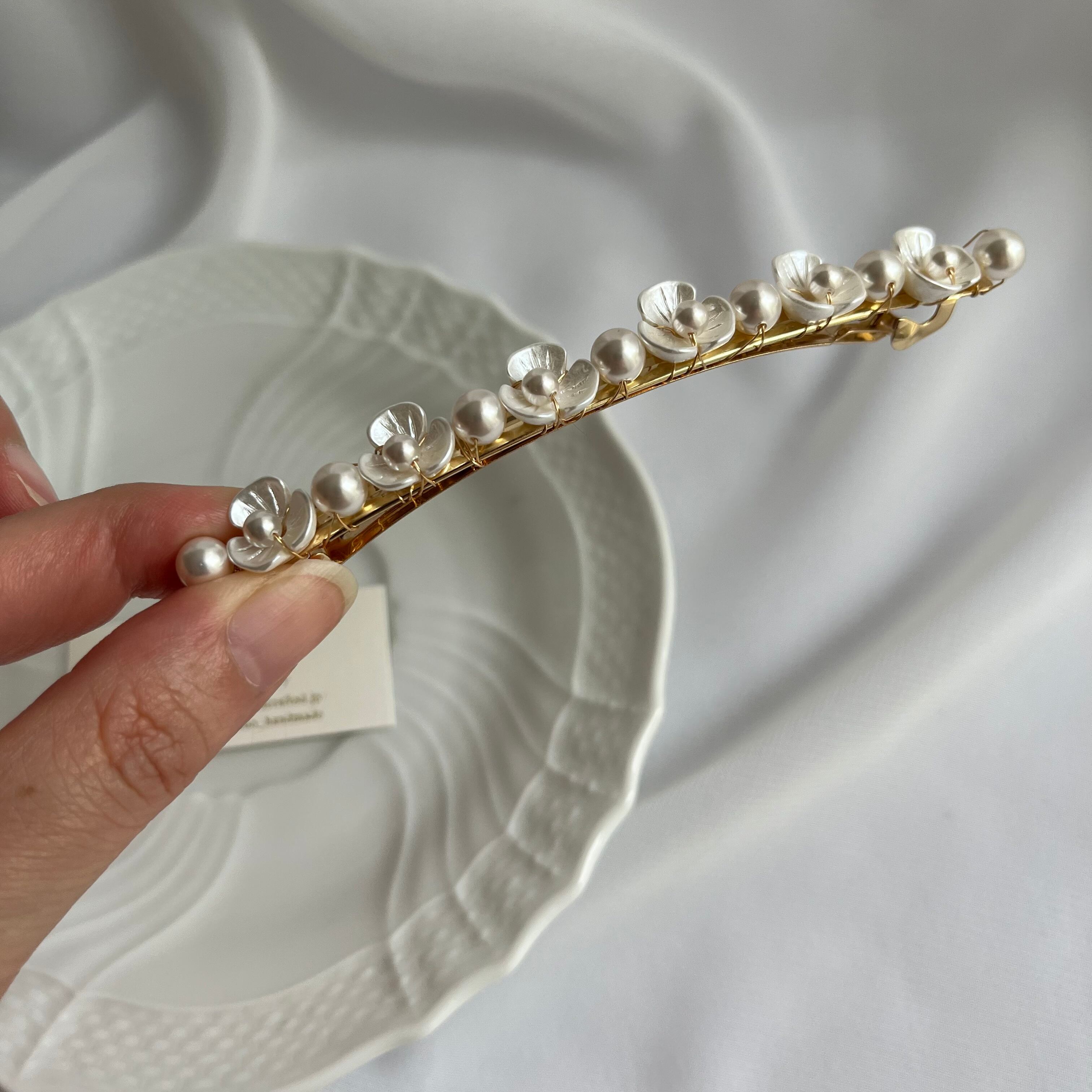 白い花とパールが上品な印象を演出するロングバレッタ。ヘアスタイルに上質な華やかさをプラスできるアイテムです。シンプルながらも存在感を放ち、結婚式やパーティーなど特別な日にぴったりのアクセサリーです。普段のカジュアルスタイルにも取り入れやすく、幅広いシーンで活躍してくれます。