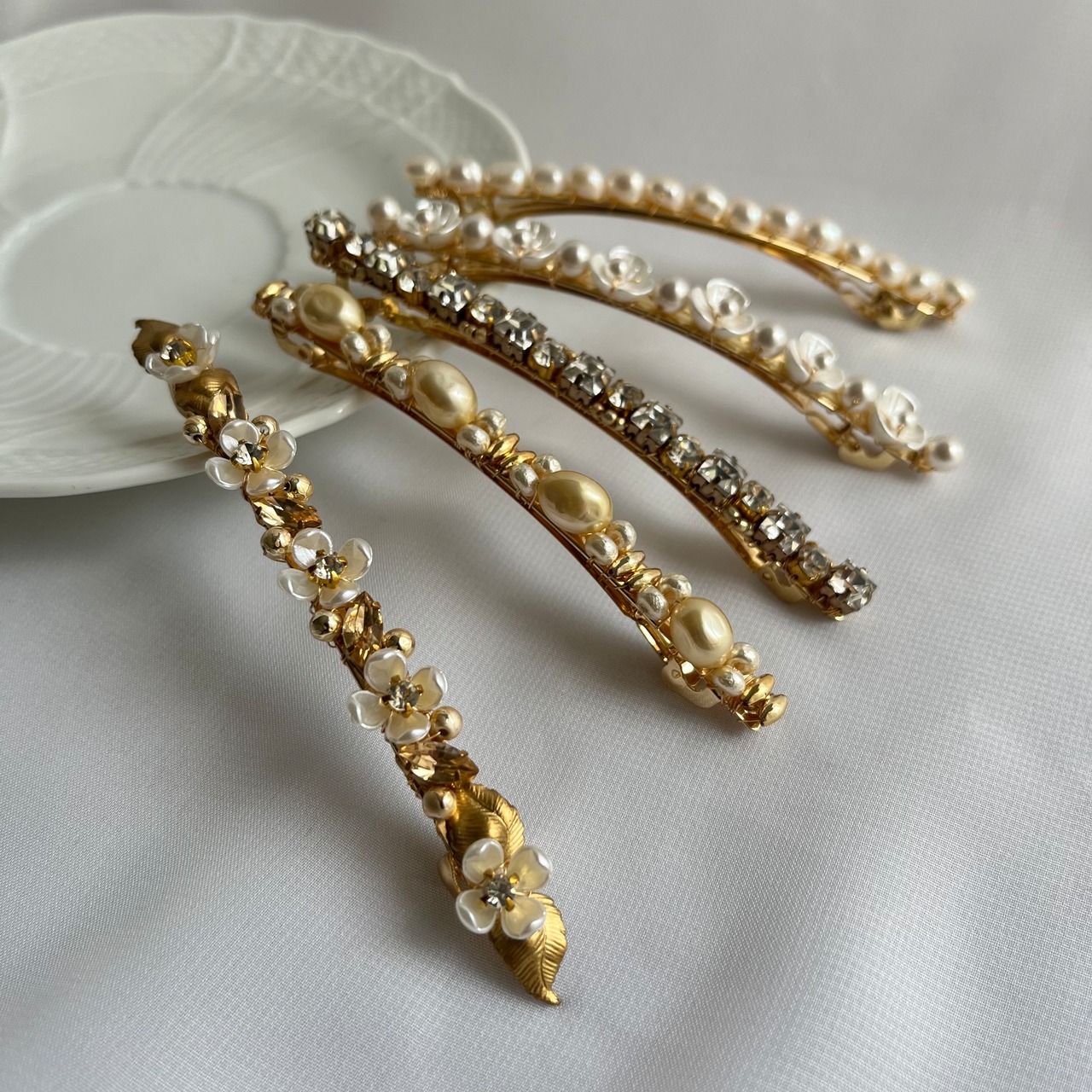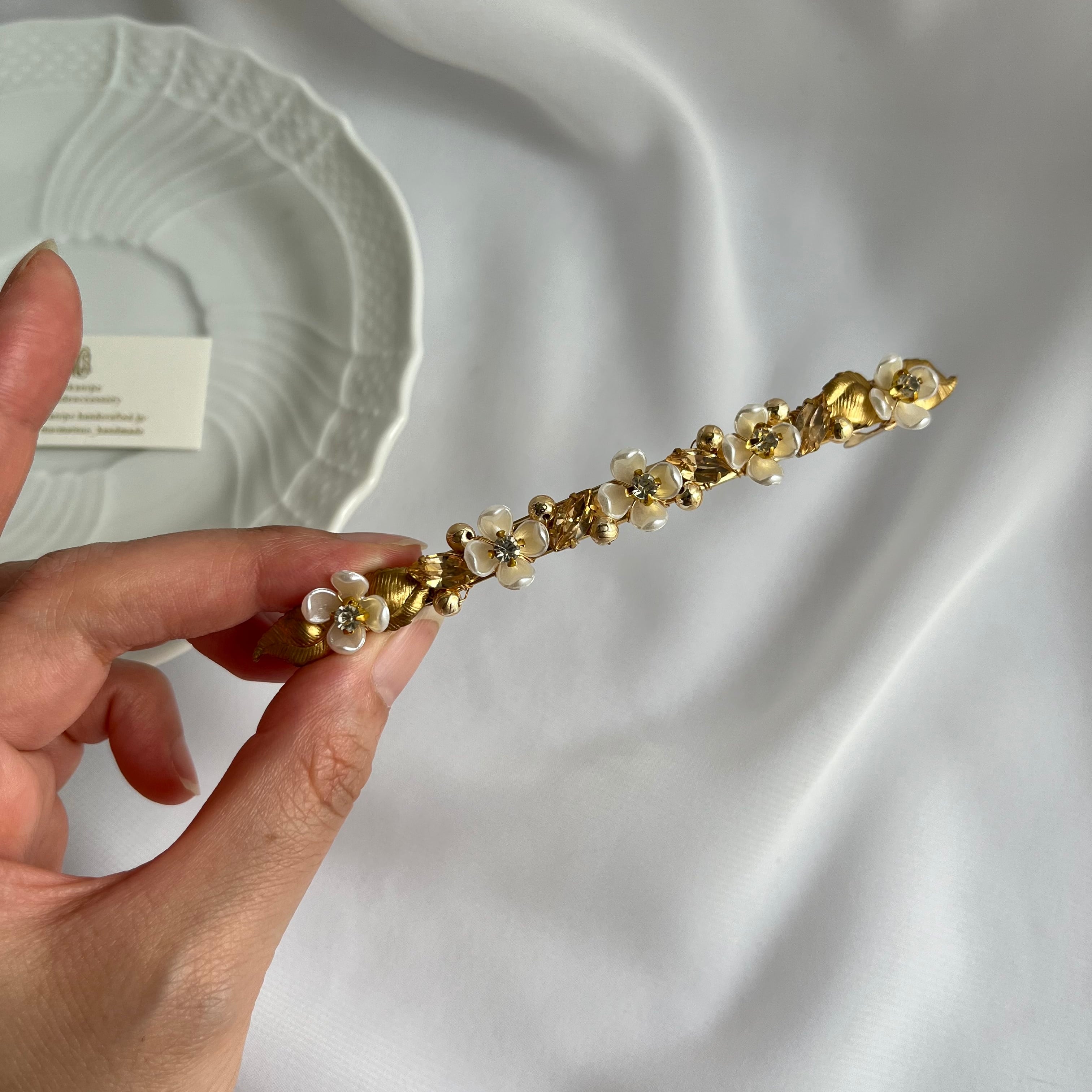 白い花々とガラスストーンが輝くロングバレッタ。上品なビジューデザインが髪に華やかな輝きを添えます。お花にはクリスタルカラーのガラスストーンで装飾し、その周りには淡いベージュカラーのストーンや真鍮リーフ、ゴールドビーズで装飾してレトロな雰囲気に仕上げています。