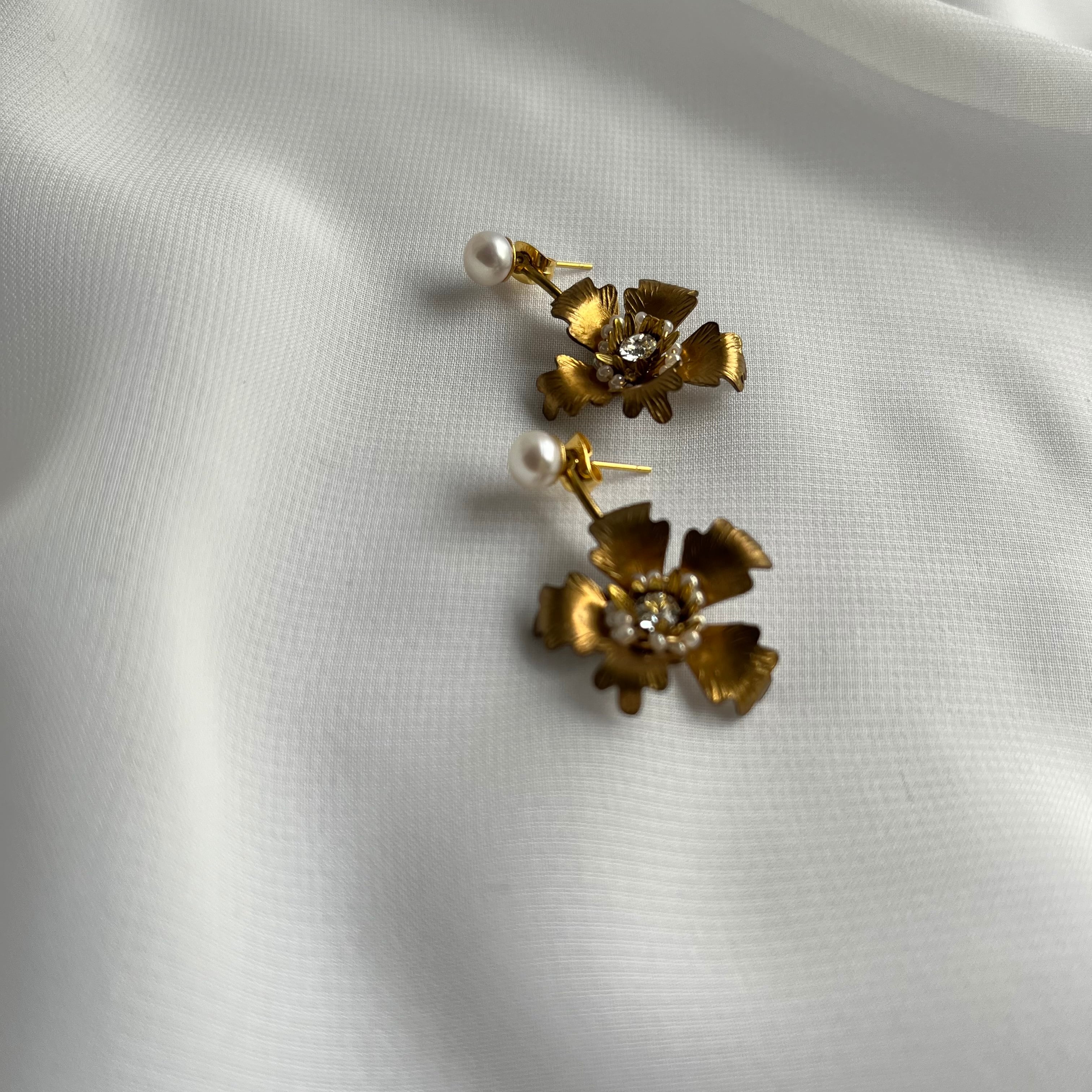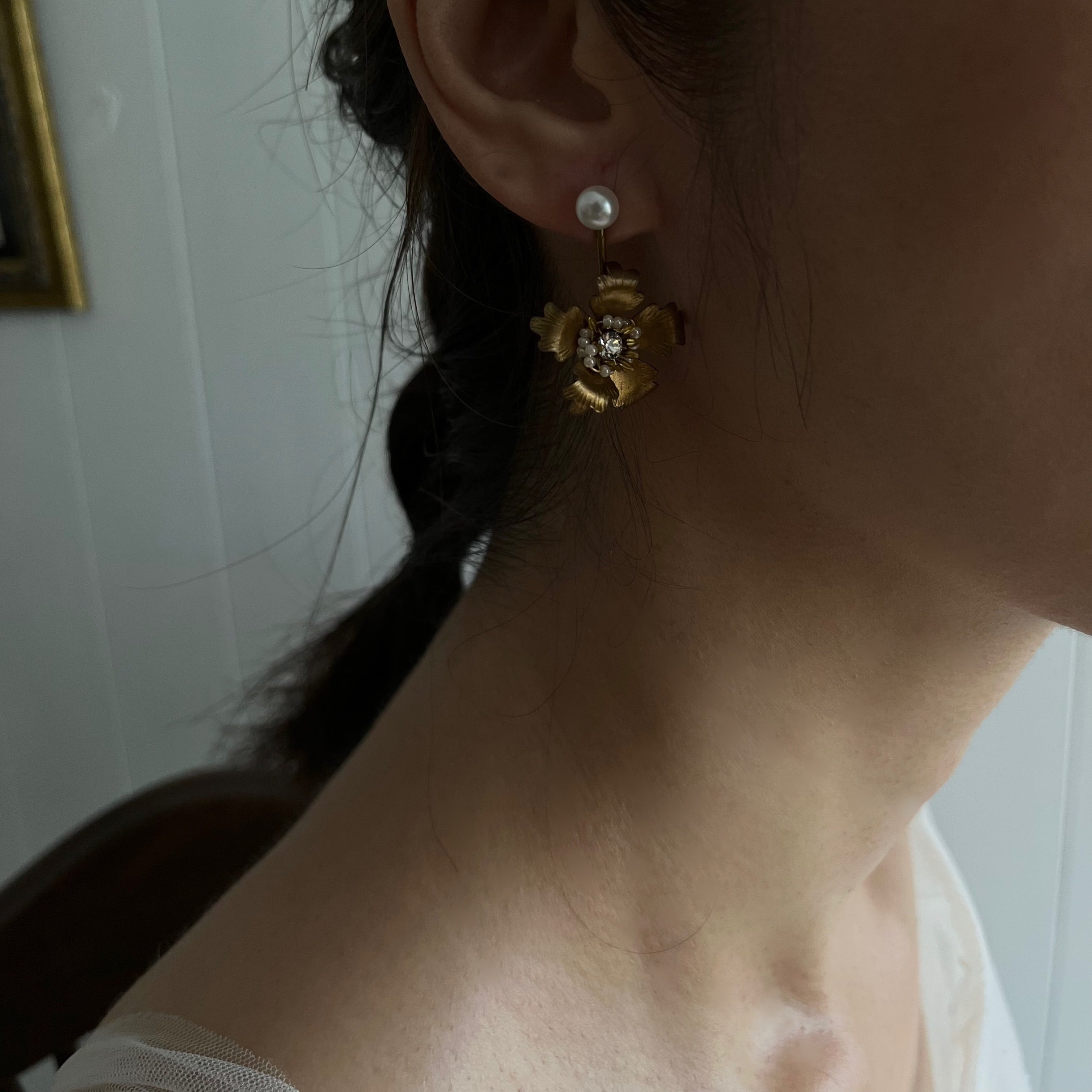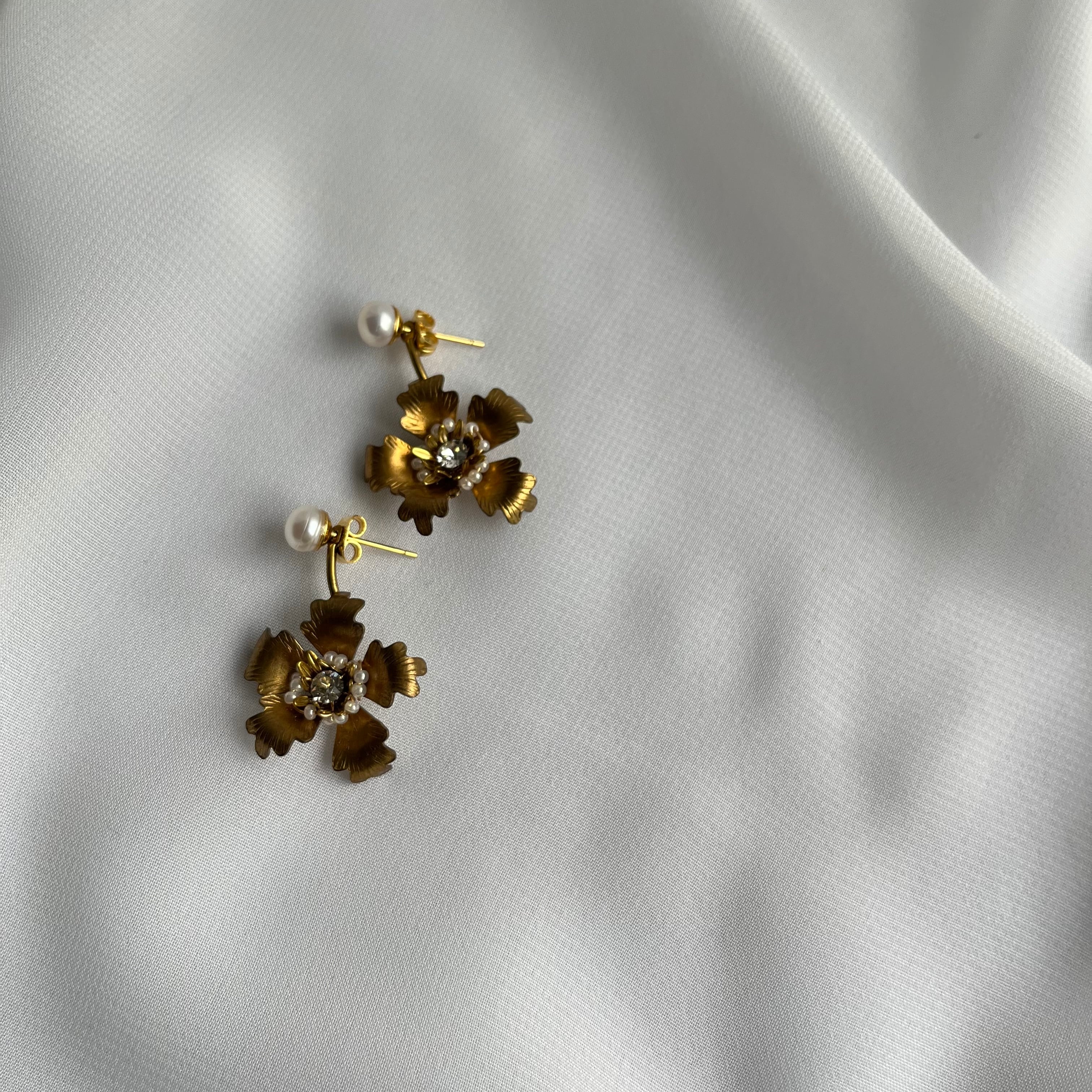 耳元の小粒の淡水パールと華やかで可愛らしいデザインが耳元を上品に彩ります。真鍮製の花のディテールが美しく、存在感のあるアクセサリーとしておすすめです。普段使いからパーティーやウェディングまで幅広くお楽しみいただけると思います。