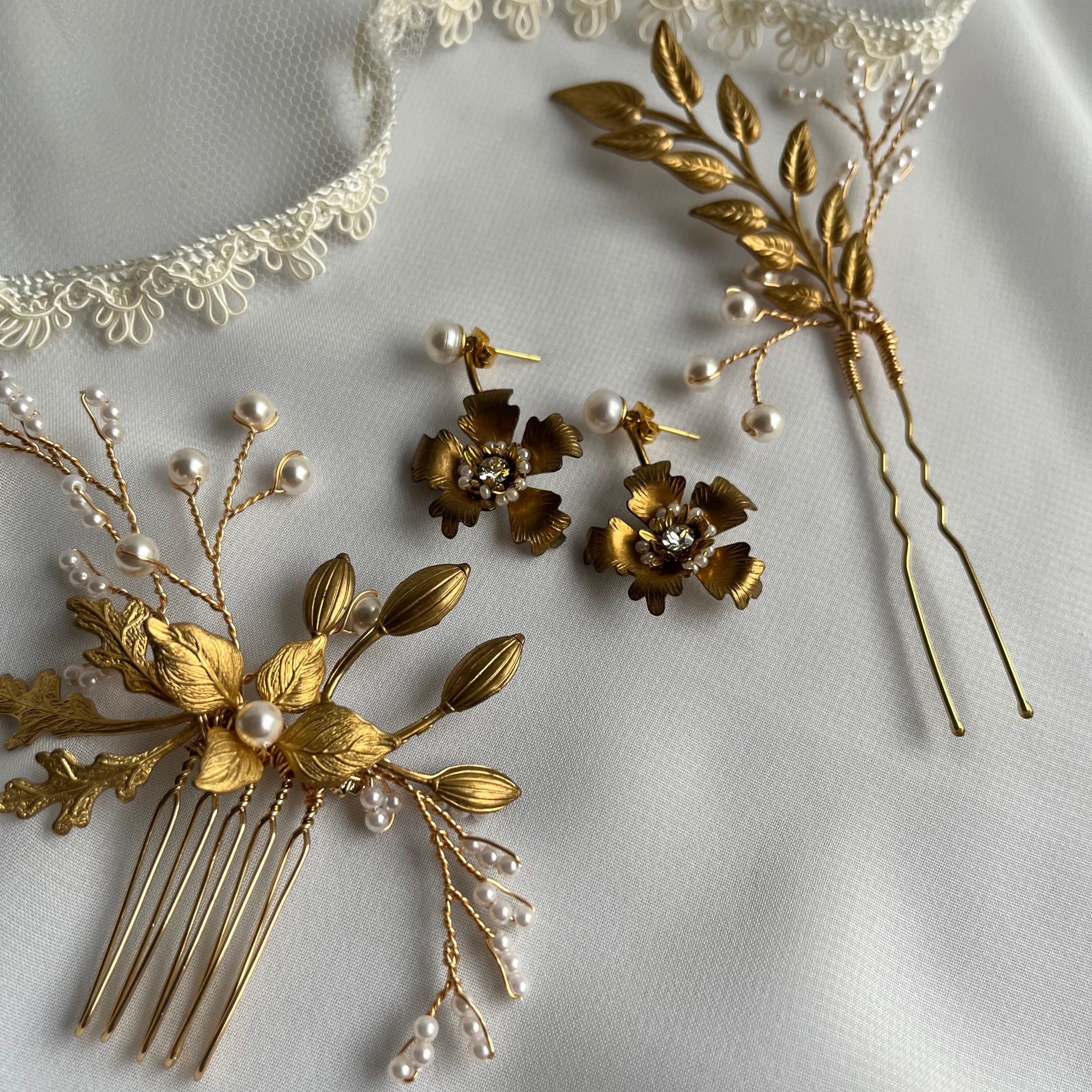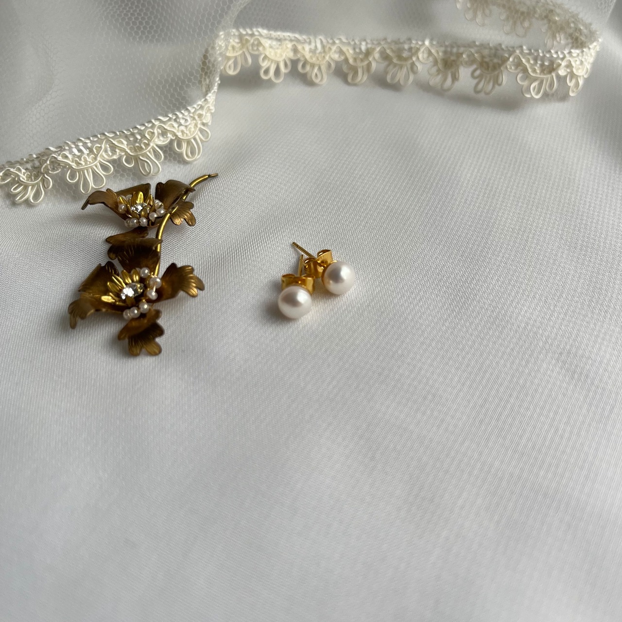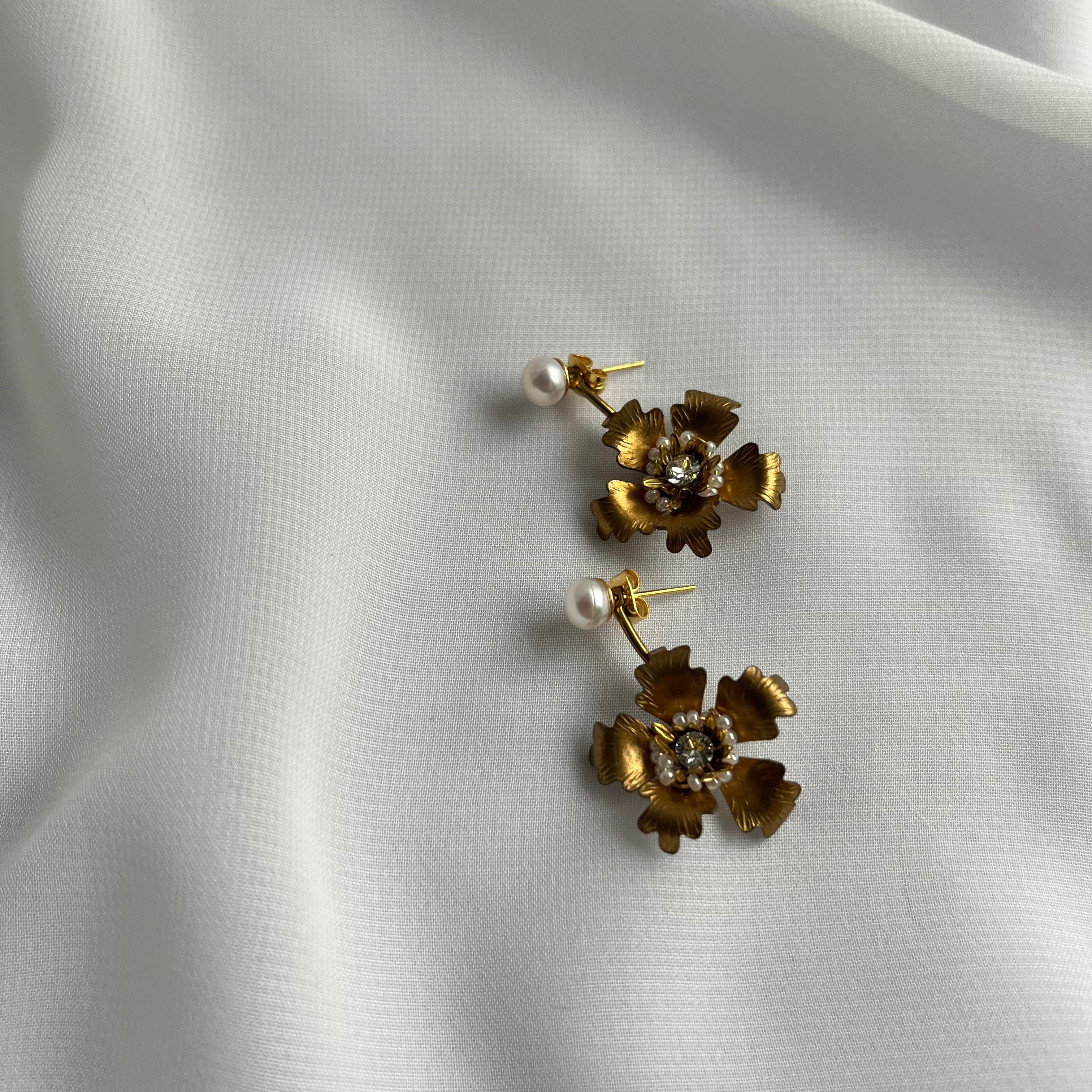 耳元の小粒の淡水パールと華やかで可愛らしいデザインが耳元を上品に彩ります。真鍮製の花のディテールが美しく、存在感のあるアクセサリーとしておすすめです。普段使いからパーティーやウェディングまで幅広くお楽しみいただけると思います。