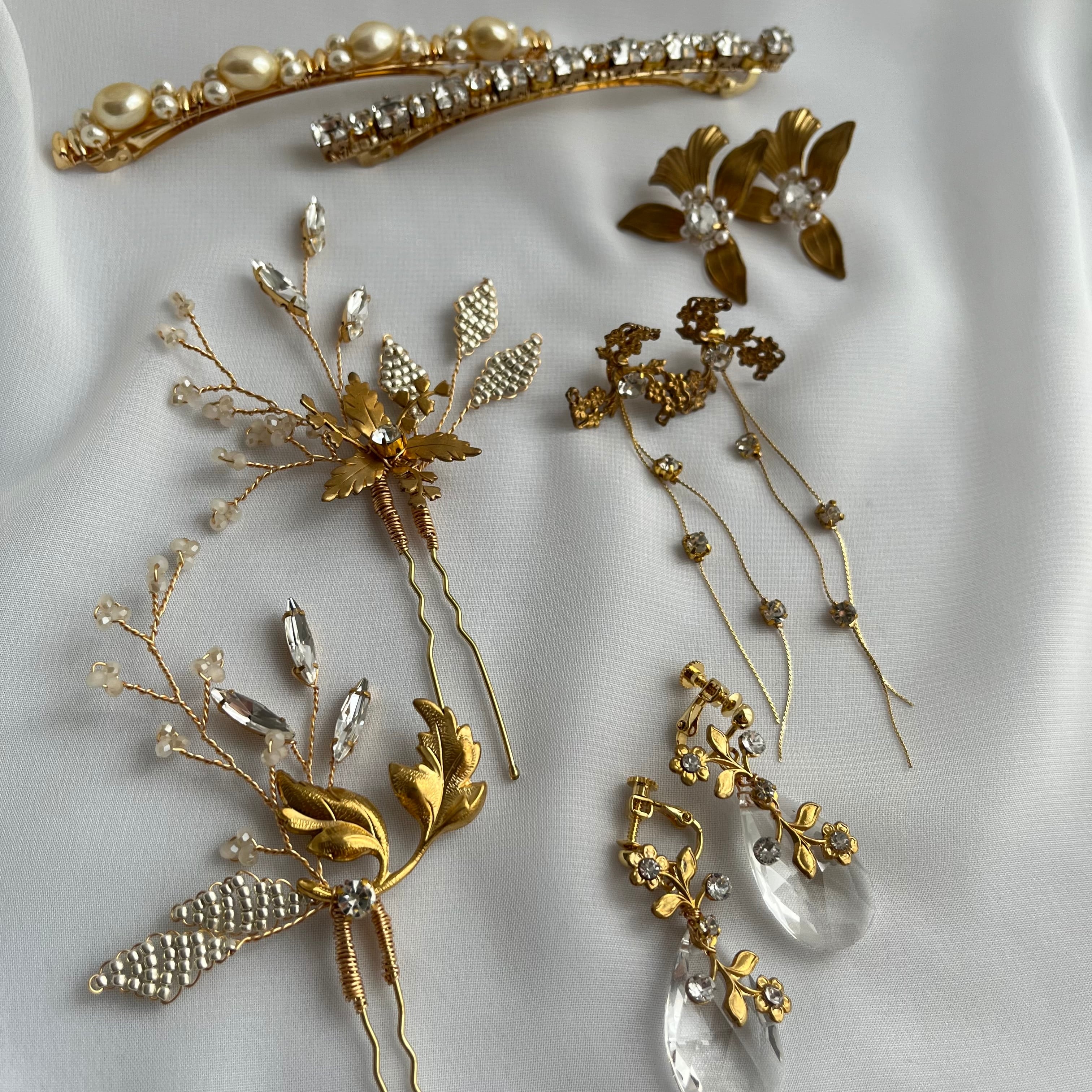 透明感のあるクリアストーンが光を反射し、耳元を華やかに彩ります。まるで宝石を身につけるような贅沢な気分に、ウェディングや特別なイベントにぴったりのアイテムに仕上げました。